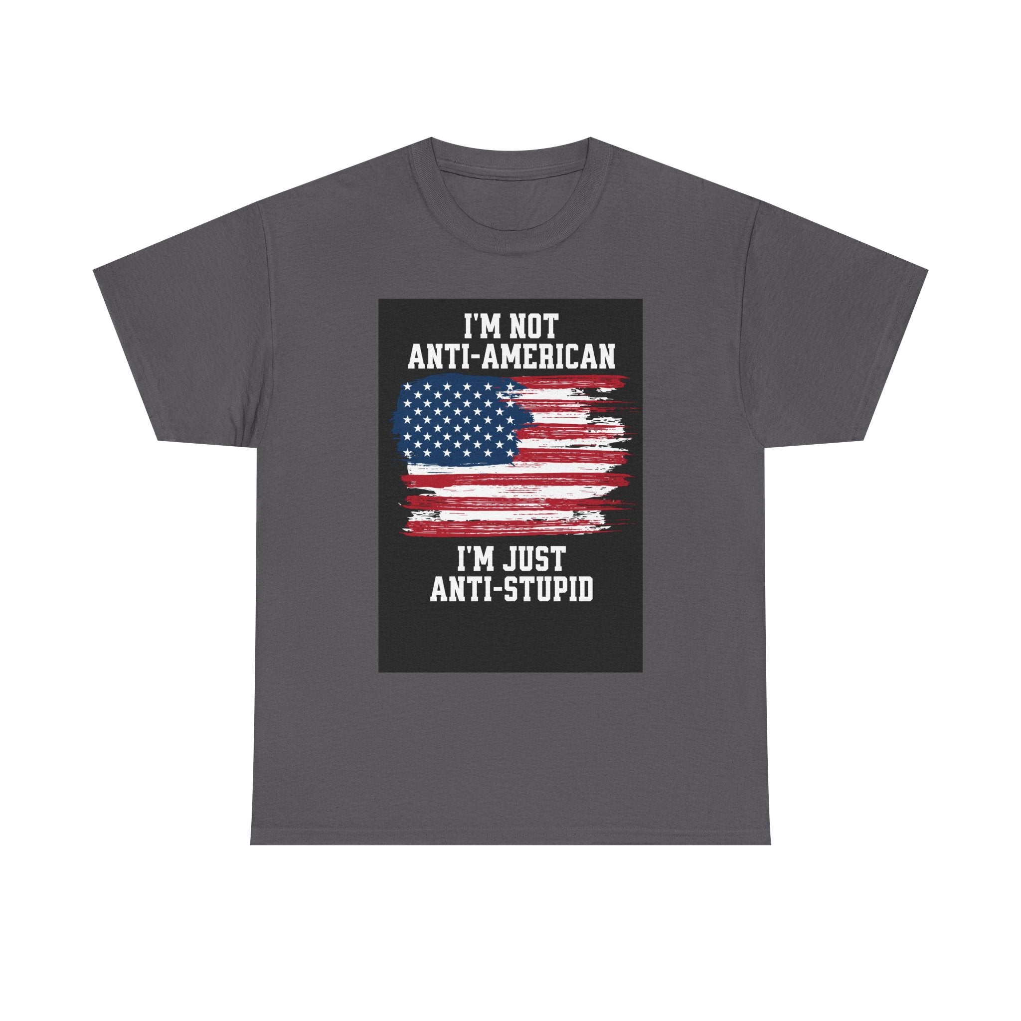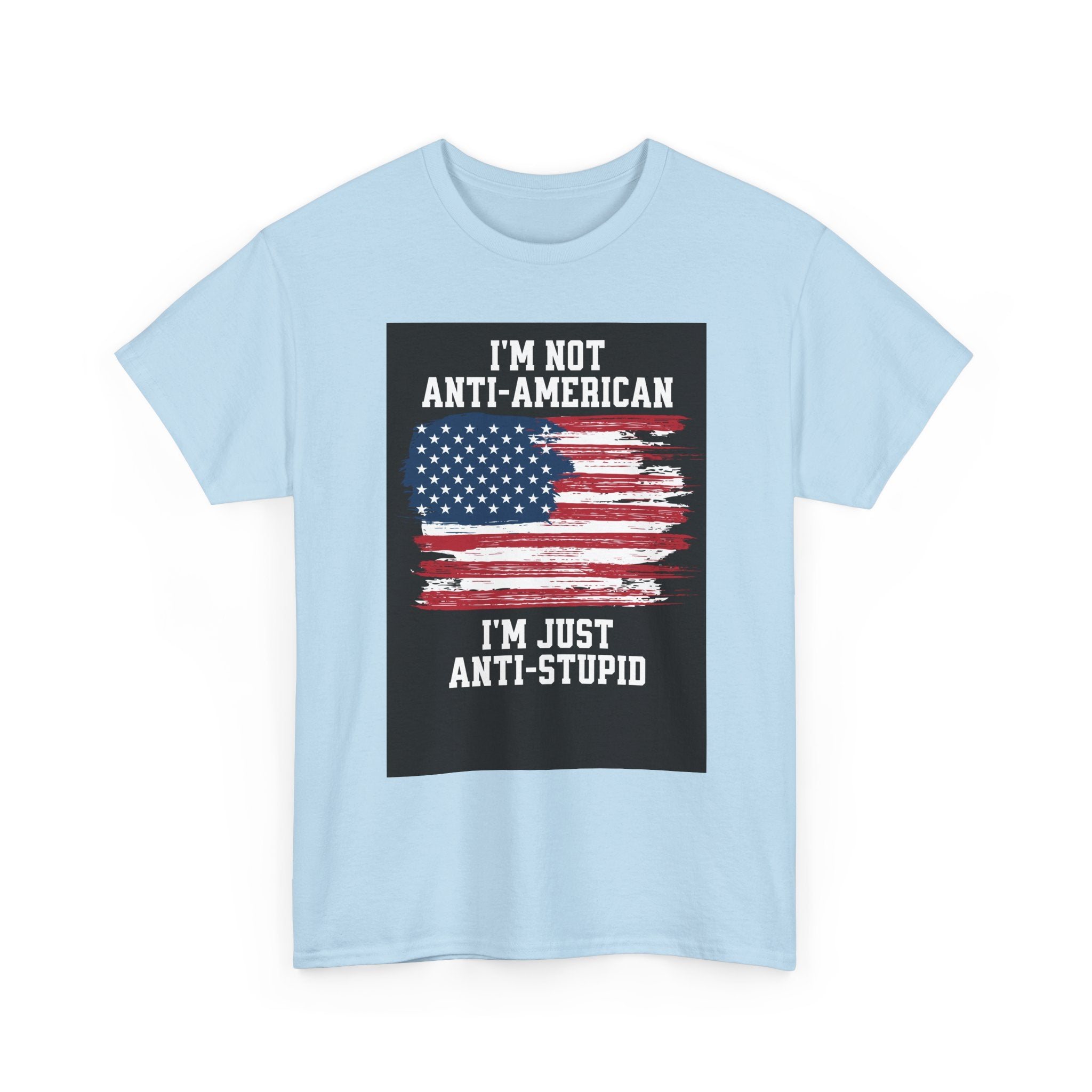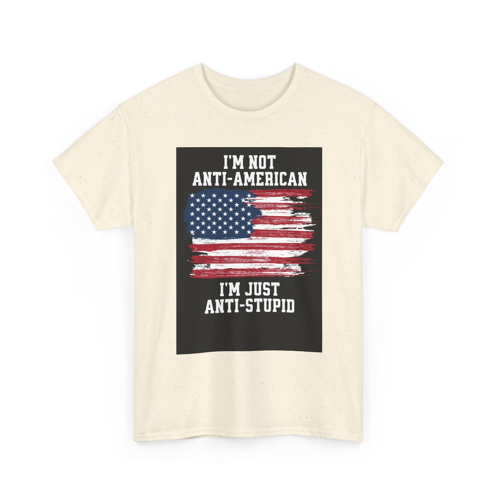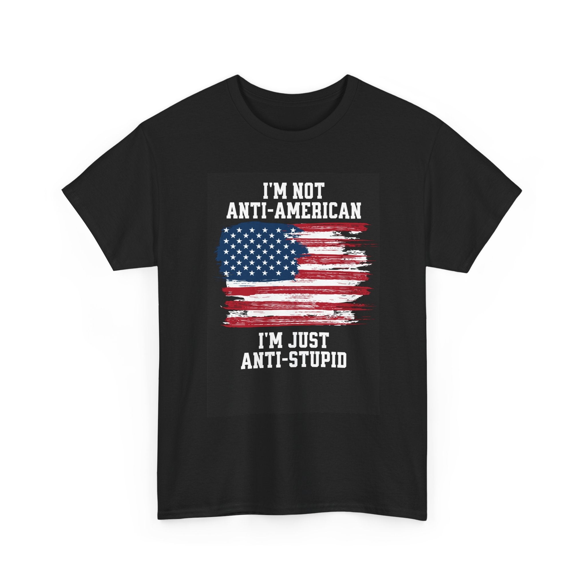A bold, statement-making tee for people who speak plainly and value common sense over empty slogans. The graphic centers on a distressed American flag with the line “I’m not anti-American” above and “I’m just anti-stupid” below — a blunt, unapologetic message that sits proudly on a solid black canvas. The shirt’s relaxed fit and classic crew neckline let it layer easily under jackets or wear alone when you want your stance to be heard without shouting. It settles into weekend barbecues, debates at the diner, or quick errands — wherever a clear voice and a crisp message belong. The worn-flag look gives it a lived-in, authentic feel; it reads like something you’d reach for when you want to make a point while staying comfortable.