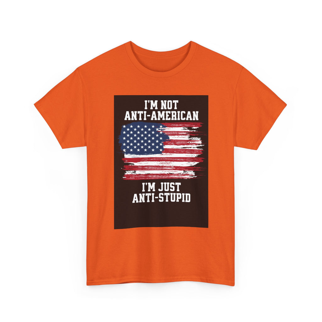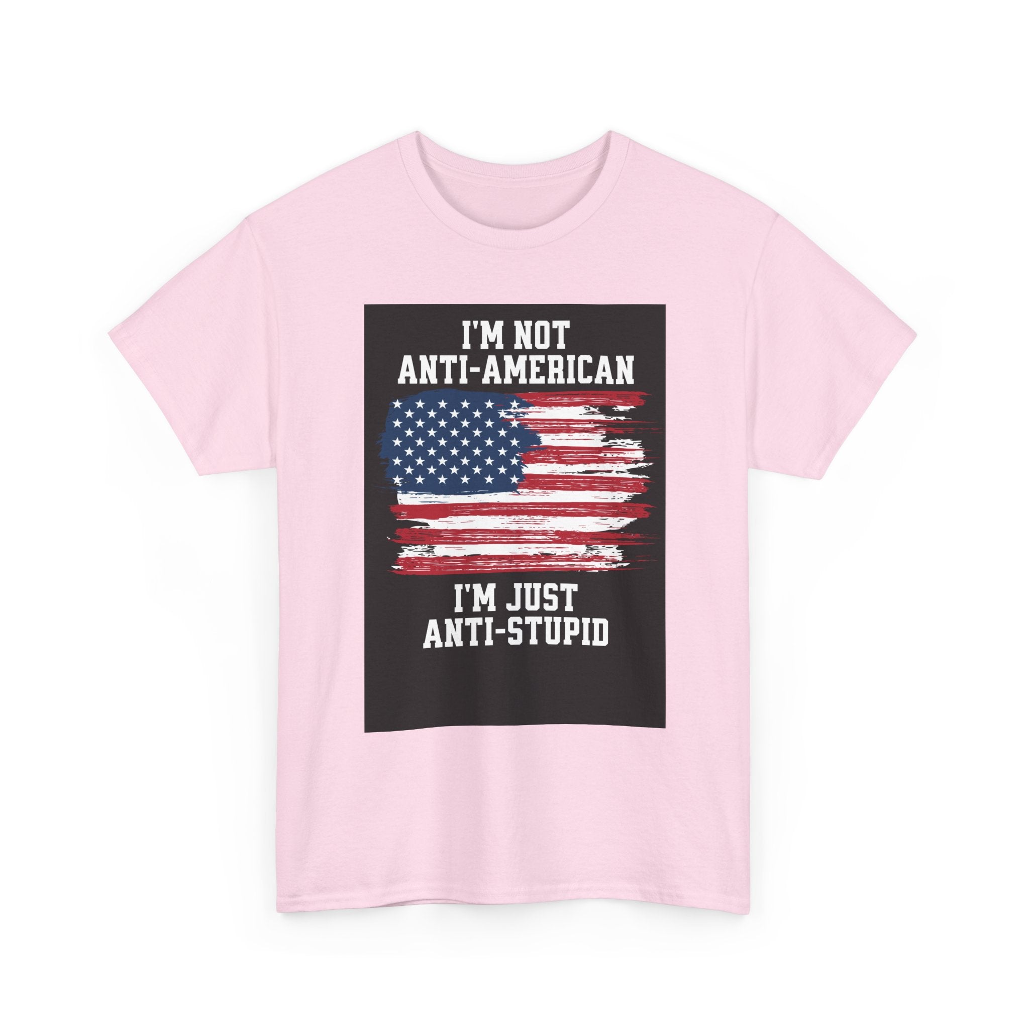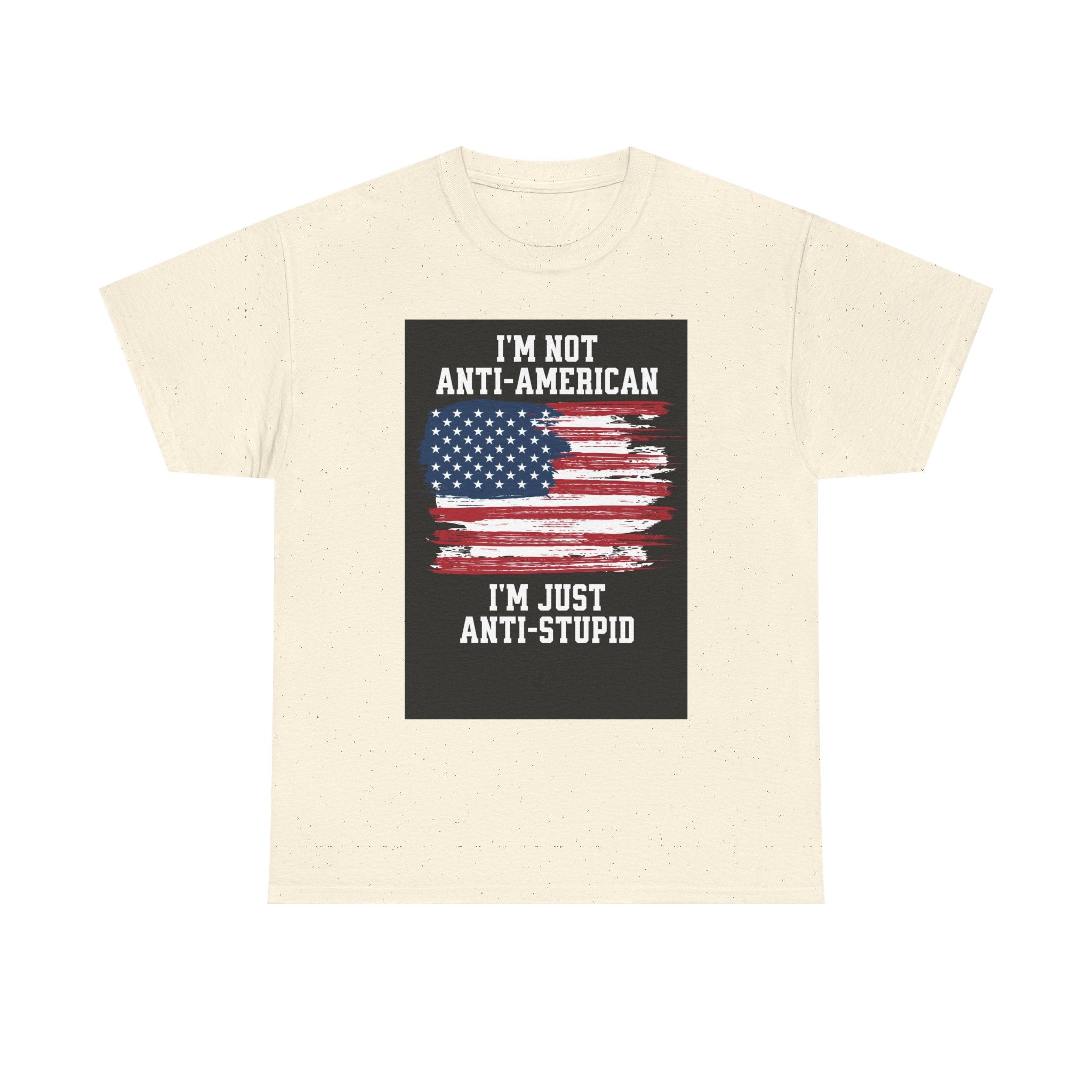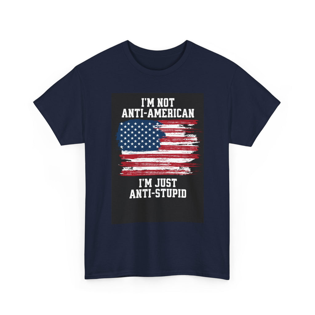 A bold, statement-making tee for people who speak plainly and value common sense over empty slogans. The graphic centers on a distressed American flag with the line “I’m not anti-American” above and “I’m just anti-stupid” below — a blunt, unapologetic message that sits proudly on a solid black canvas. The shirt’s relaxed fit and classic crew neckline let it layer easily under jackets or wear alone when you want your stance to be heard without shouting. It settles into weekend barbecues, debates at the diner, or quick errands — wherever a clear voice and a crisp message belong. The worn-flag look gives it a lived-in, authentic feel; it reads like something you’d reach for when you want to make a point while staying comfortable.