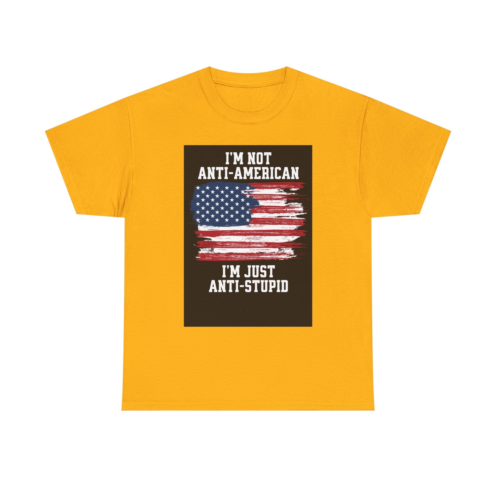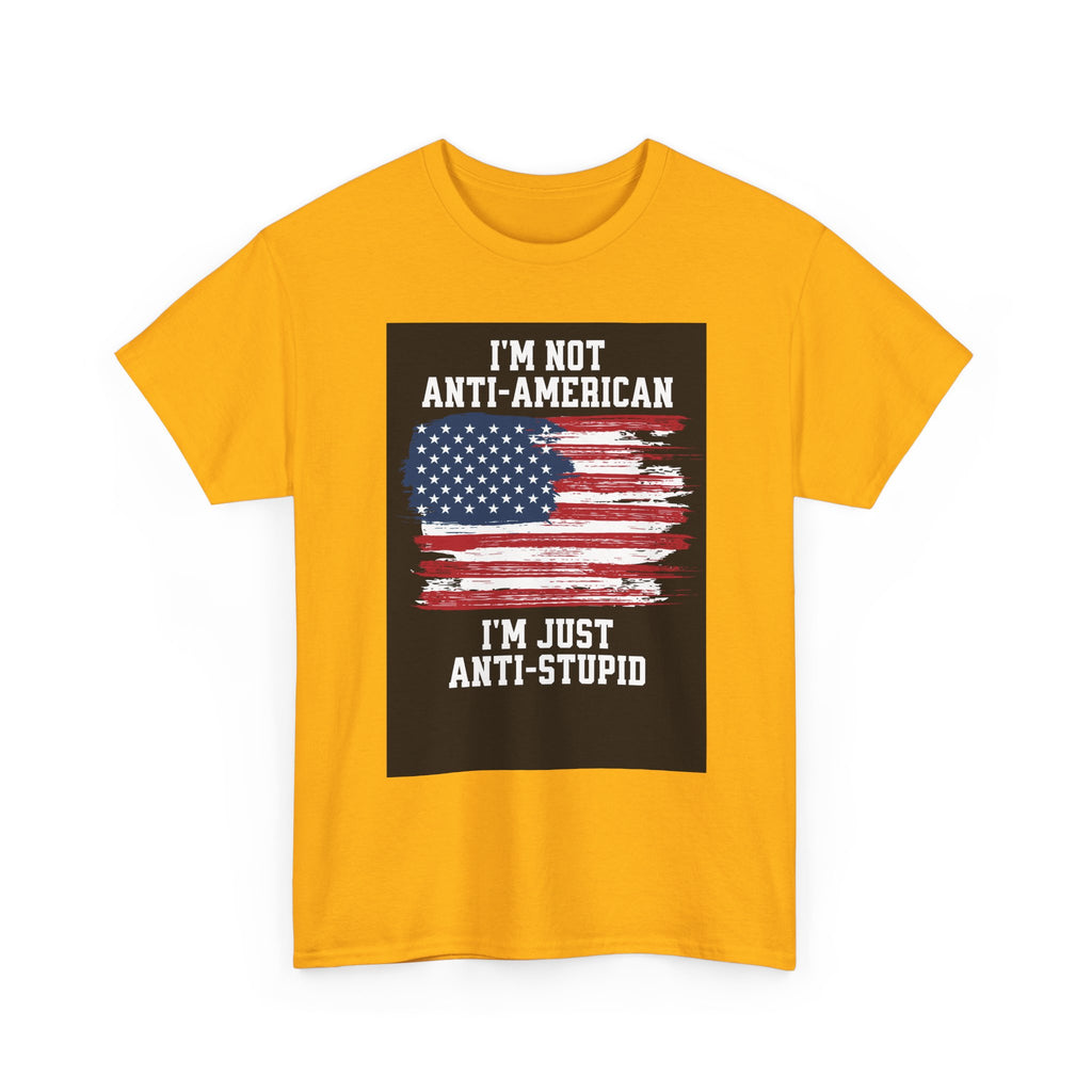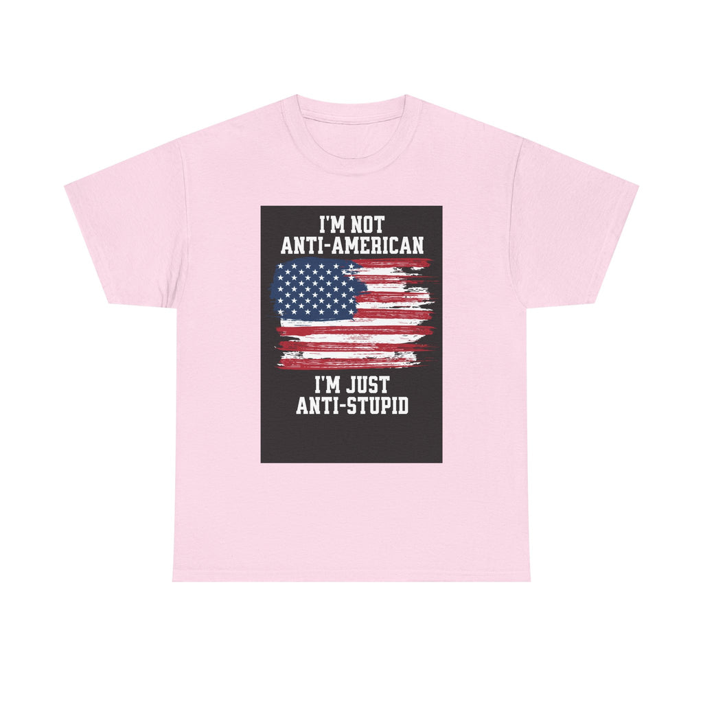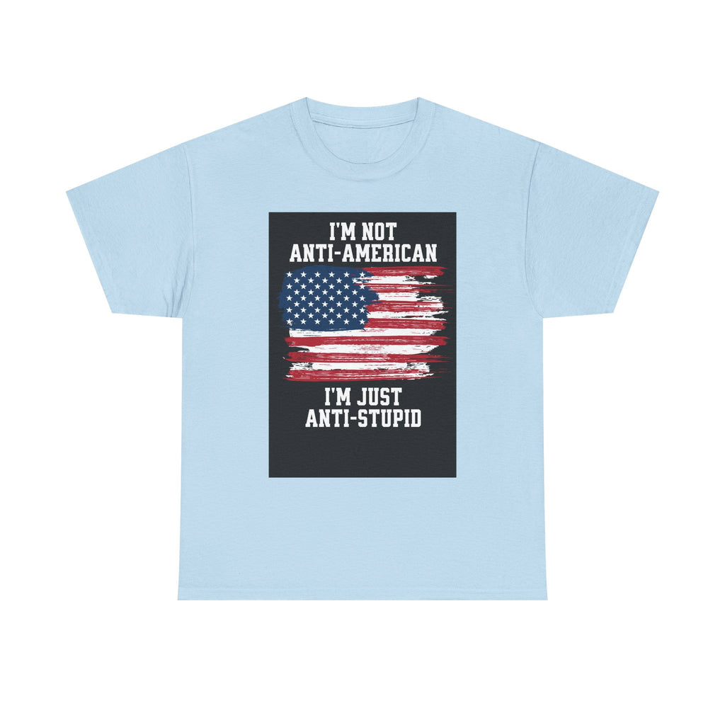A bold, statement-making tee for people who speak plainly and value common sense over empty slogans. The graphic centers on a distressed American flag with the line “I’m not anti-American” above and “I’m just anti-stupid” below — a blunt, unapologetic message that sits proudly on a solid black canvas. The shirt’s relaxed fit and classic crew neckline let it layer easily under jackets or wear alone when you want your stance to be heard without shouting. It settles into weekend barbecues, debates at the diner, or quick errands — wherever a clear voice and a crisp message belong. The worn-flag look gives it a lived-in, authentic feel; it reads like something you’d reach for when you want to make a point while staying comfortable.