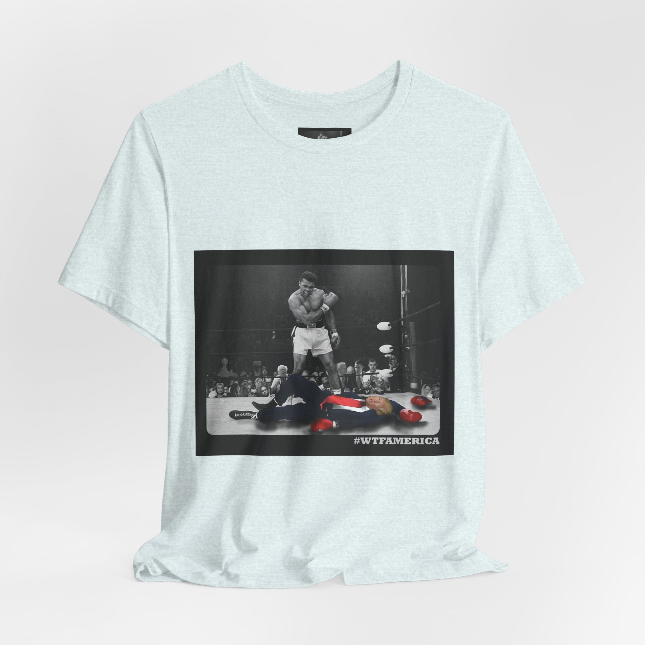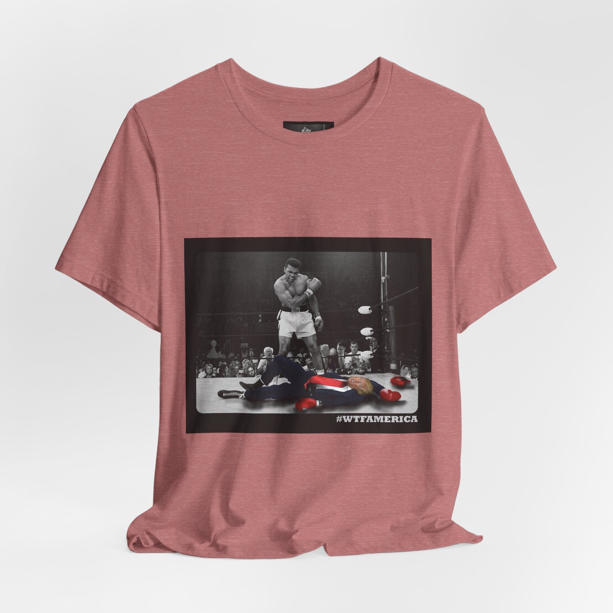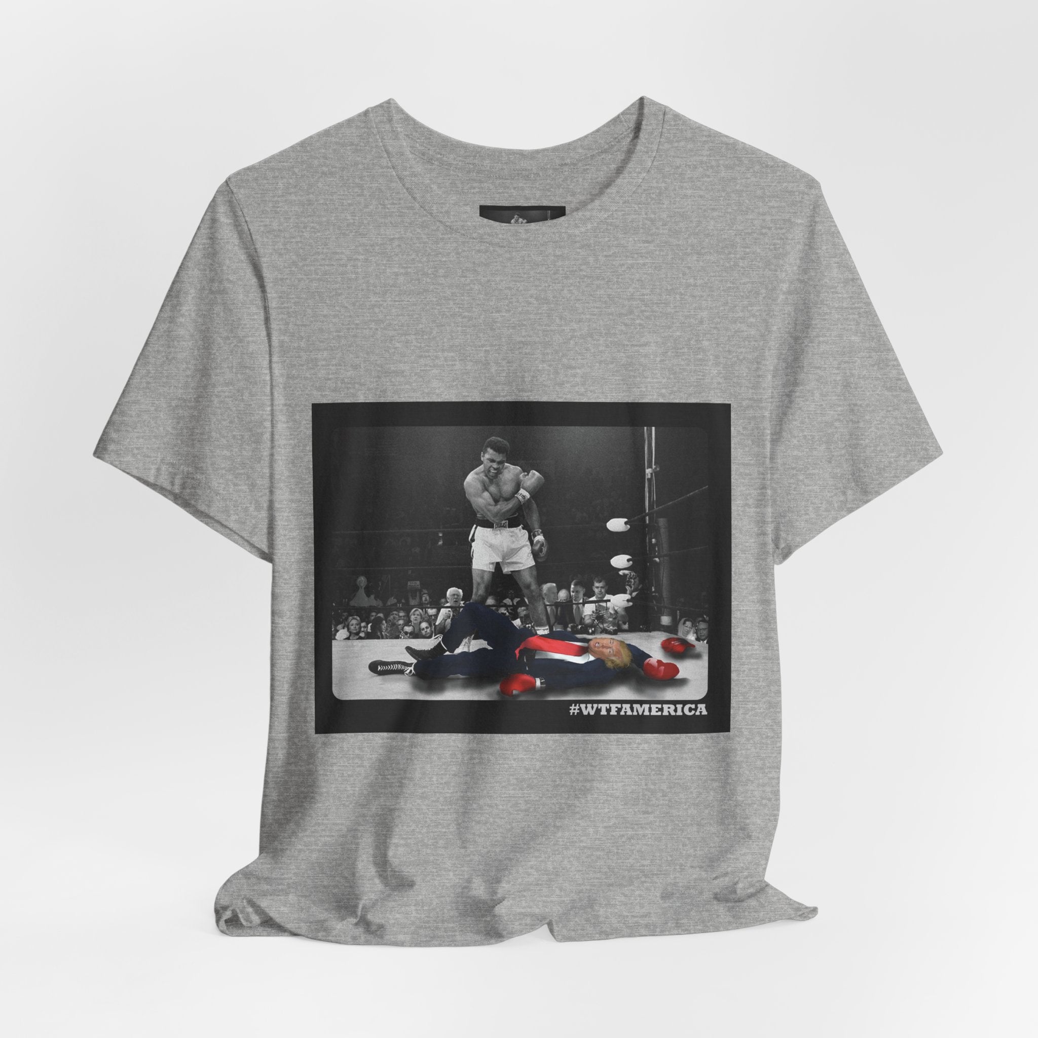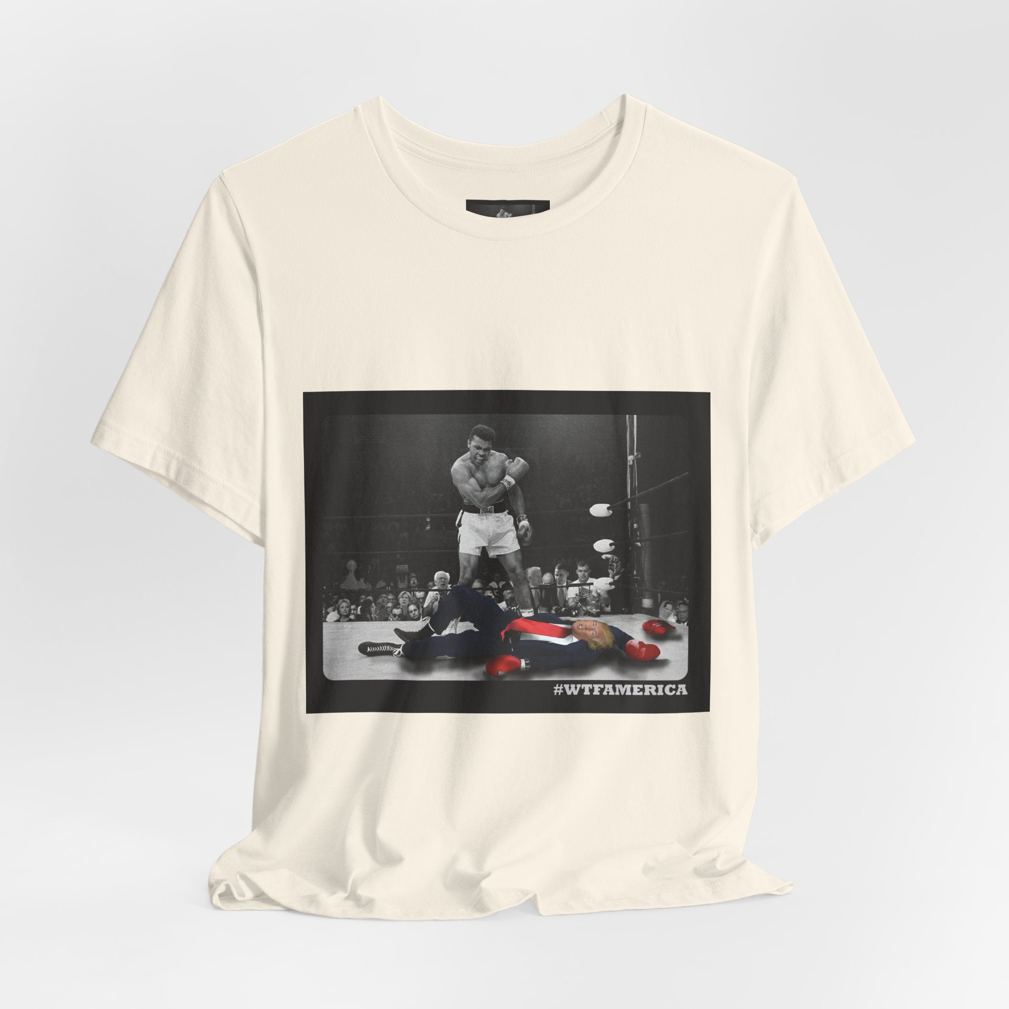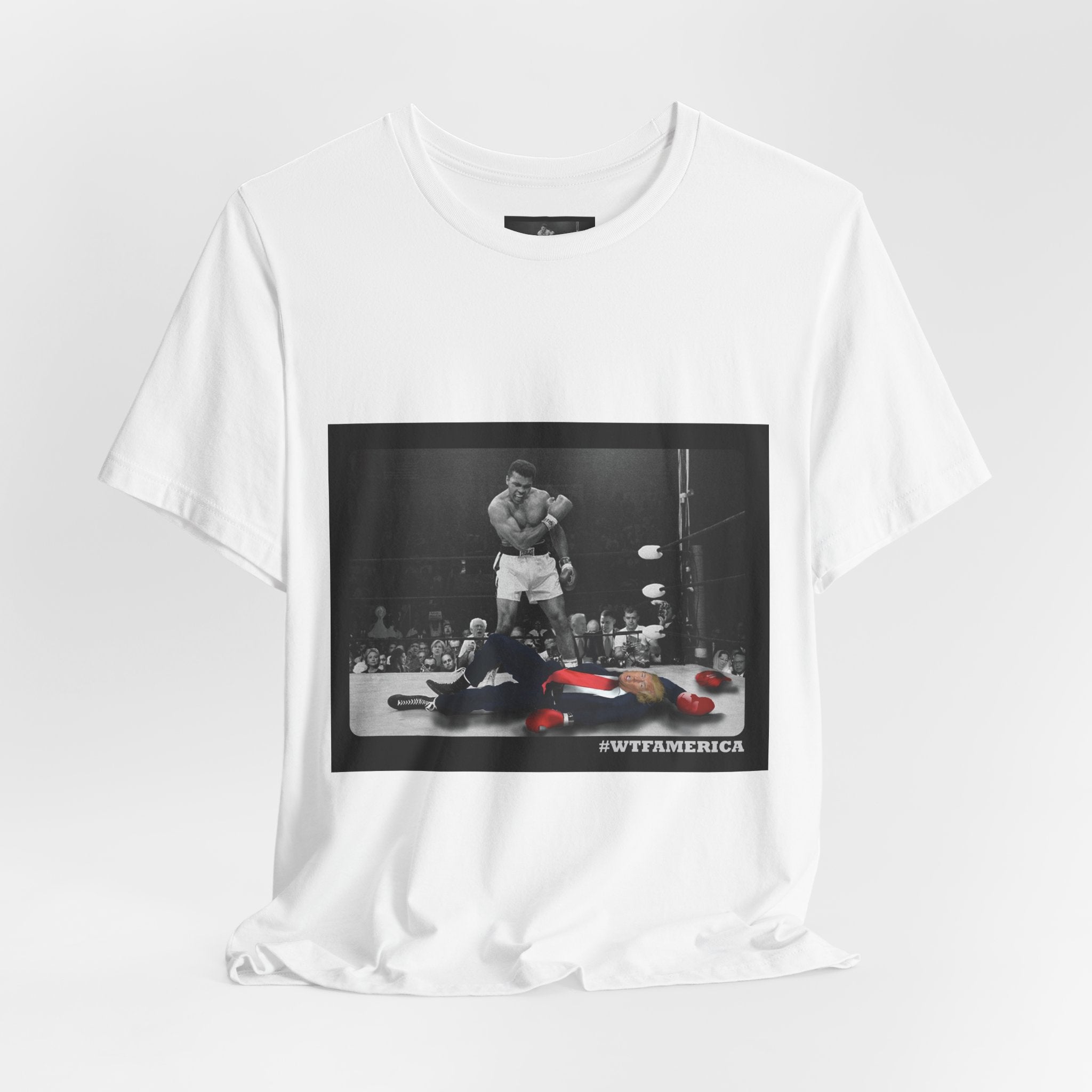 This lightweight jersey tee carries a raw, iconic moment across the chest — a black-and-white boxing scene frozen in time. Built from soft Airlume combed and ring-spun cotton, the shirt feels breathable and moves easily from morning training runs to late-night hangs. The retail cut and crew neckline keep the silhouette clean and wearable, while subtle details like side seams, shoulder tape, and a ribbed knit collar ensure the tee keeps its shape through frequent wear. The printed label and sleeve artwork use crisp DTF (with DTG on some providers) for sharp, lasting imagery. It’s made and sourced with ethical standards in mind, REACH certified and produced under fair labor practices.