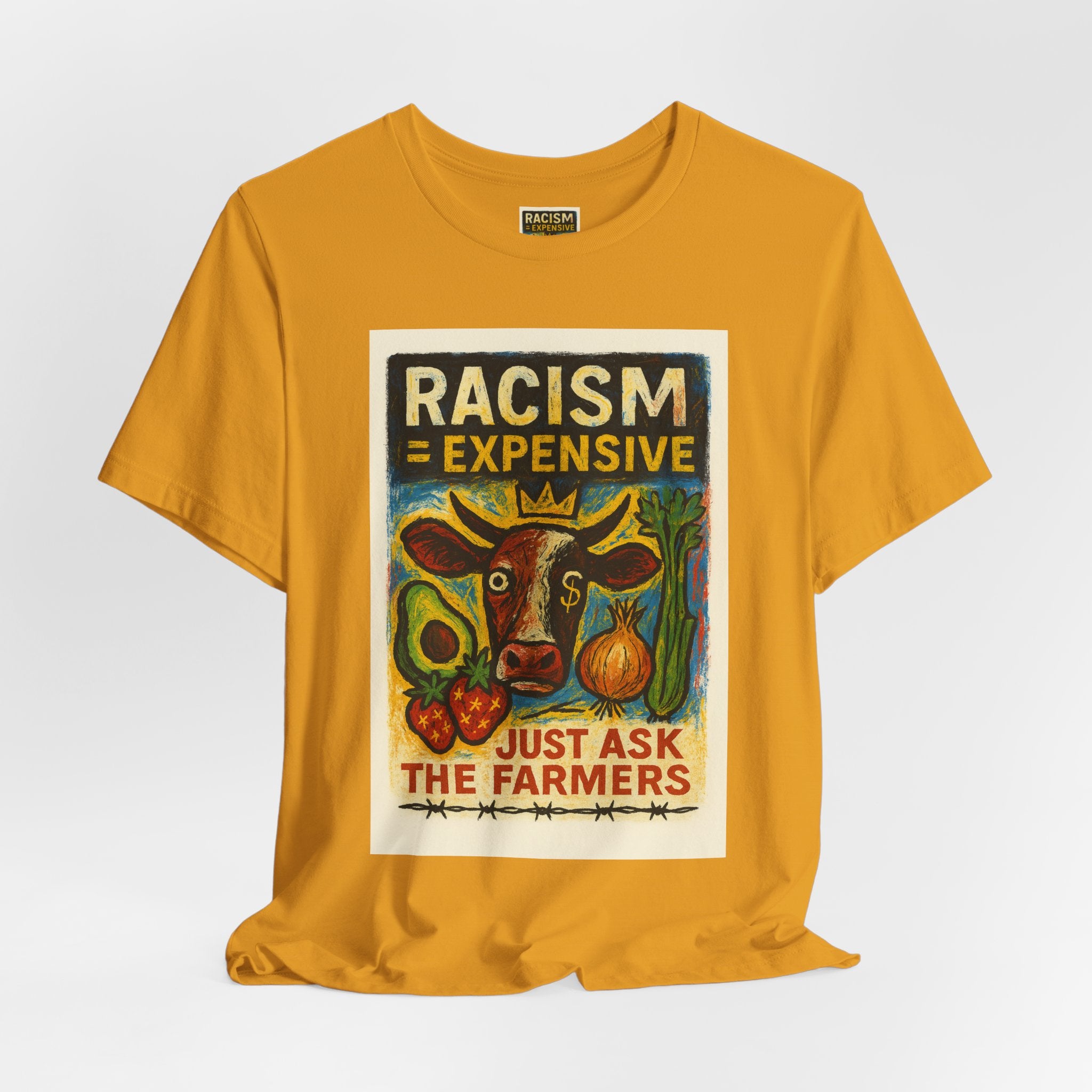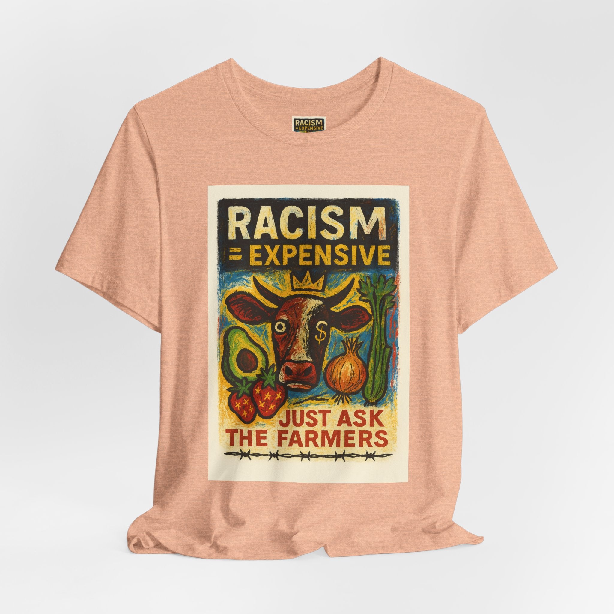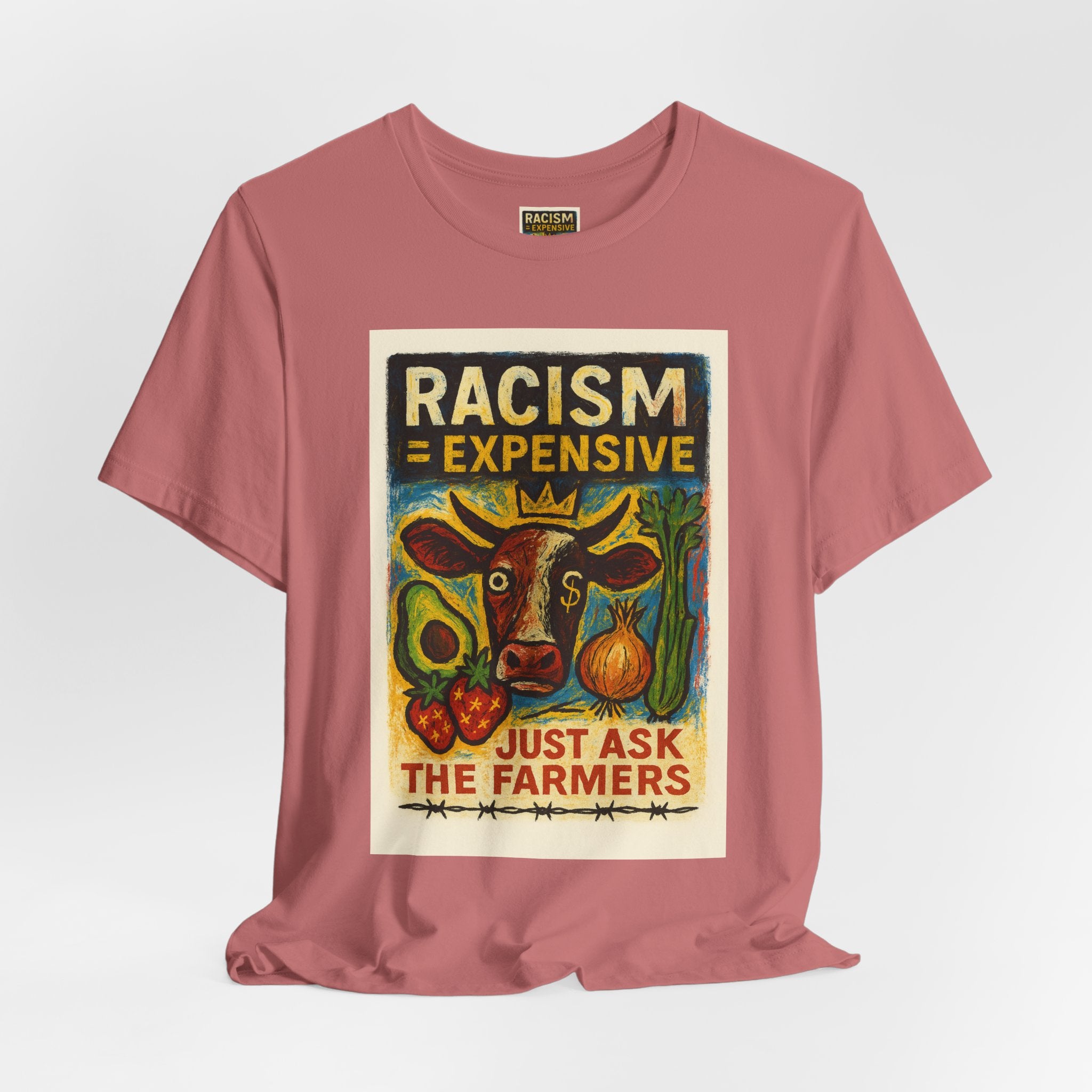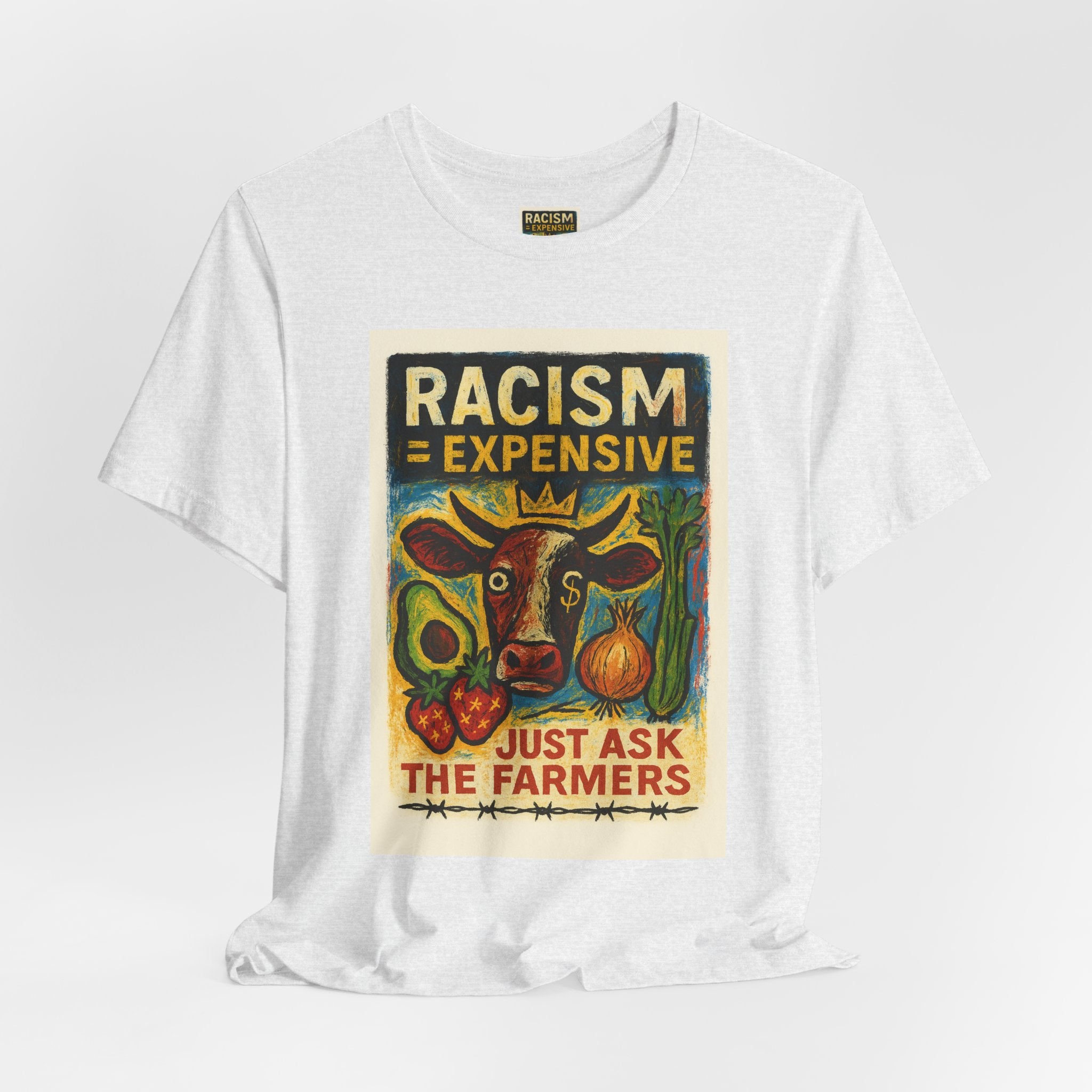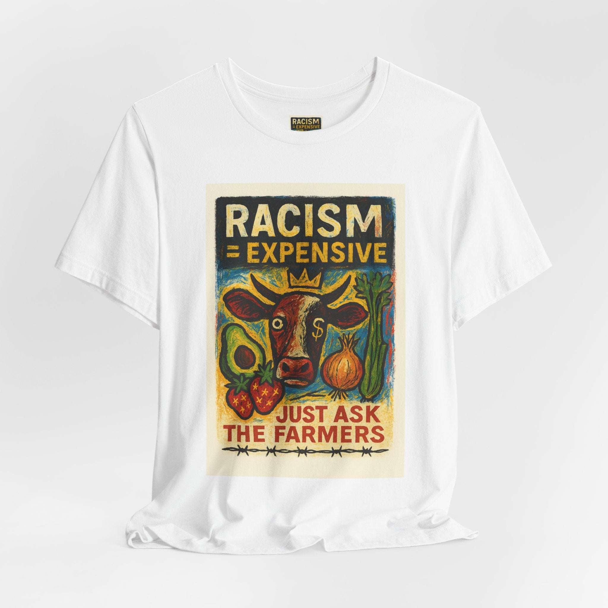 This lightweight, soft cotton tee carries a bold, hand-illustrated message: “Racism = Expensive — Just Ask The Farmers.” The vintage-style artwork centers a warm-toned cow and farm produce, blending folk-art charm with a clear social statement. Wear it when you want your clothes to speak with warmth and conviction — whether you’re at a local market, a community meeting, or out running errands. The crew neckline and retail fit keep the silhouette clean and easy to layer. Ethically made blanks and a tear-away label keep the shirt comfortable for long days on the move.