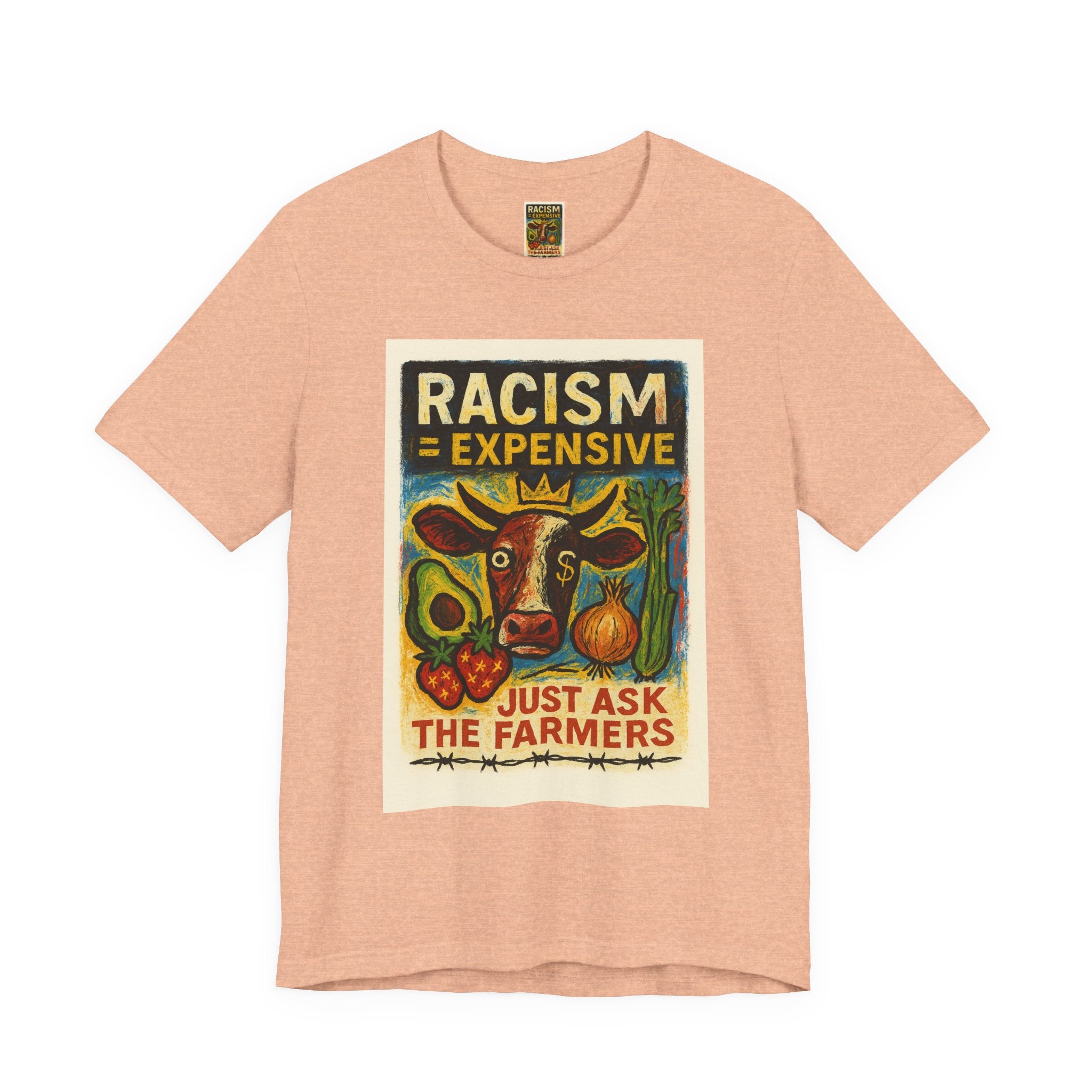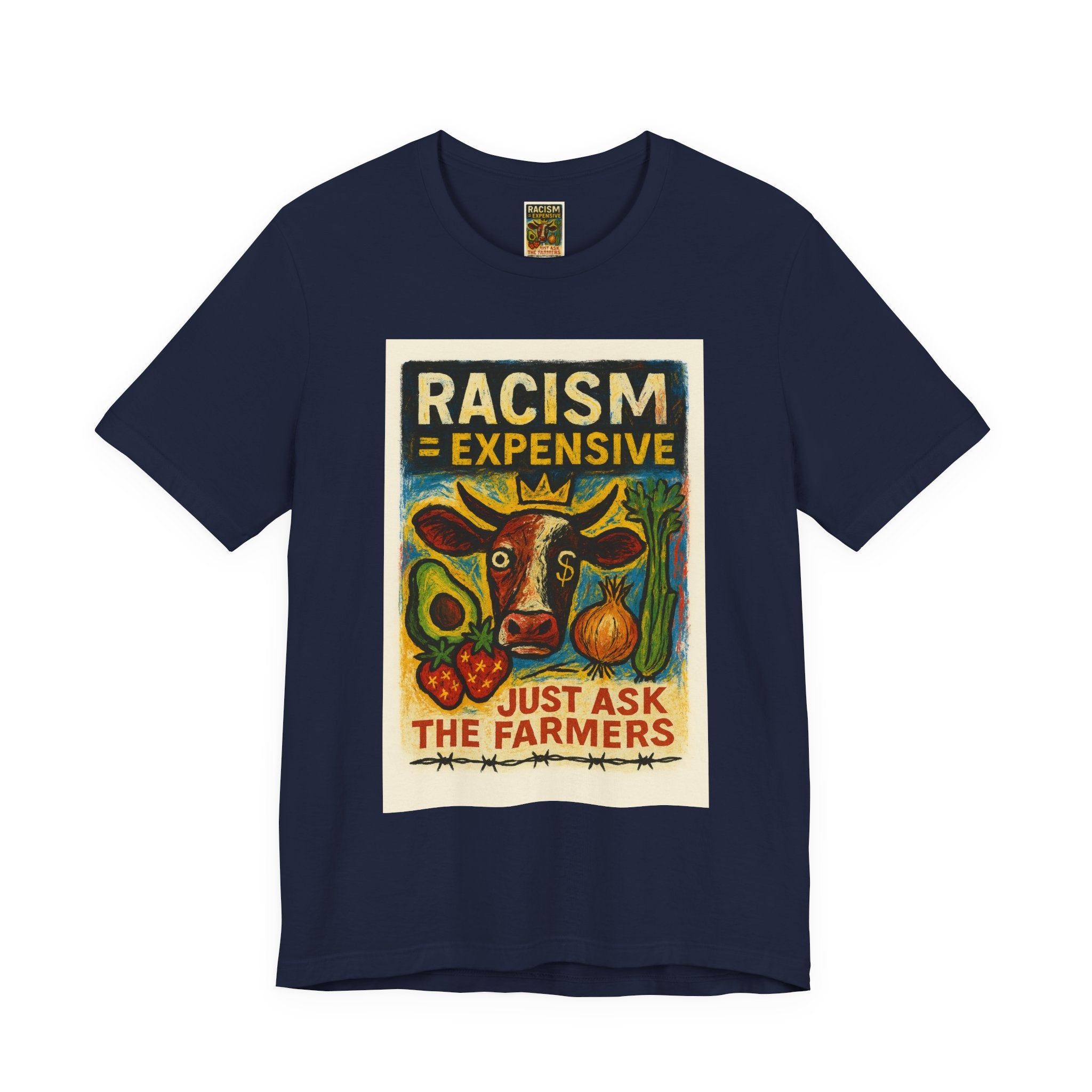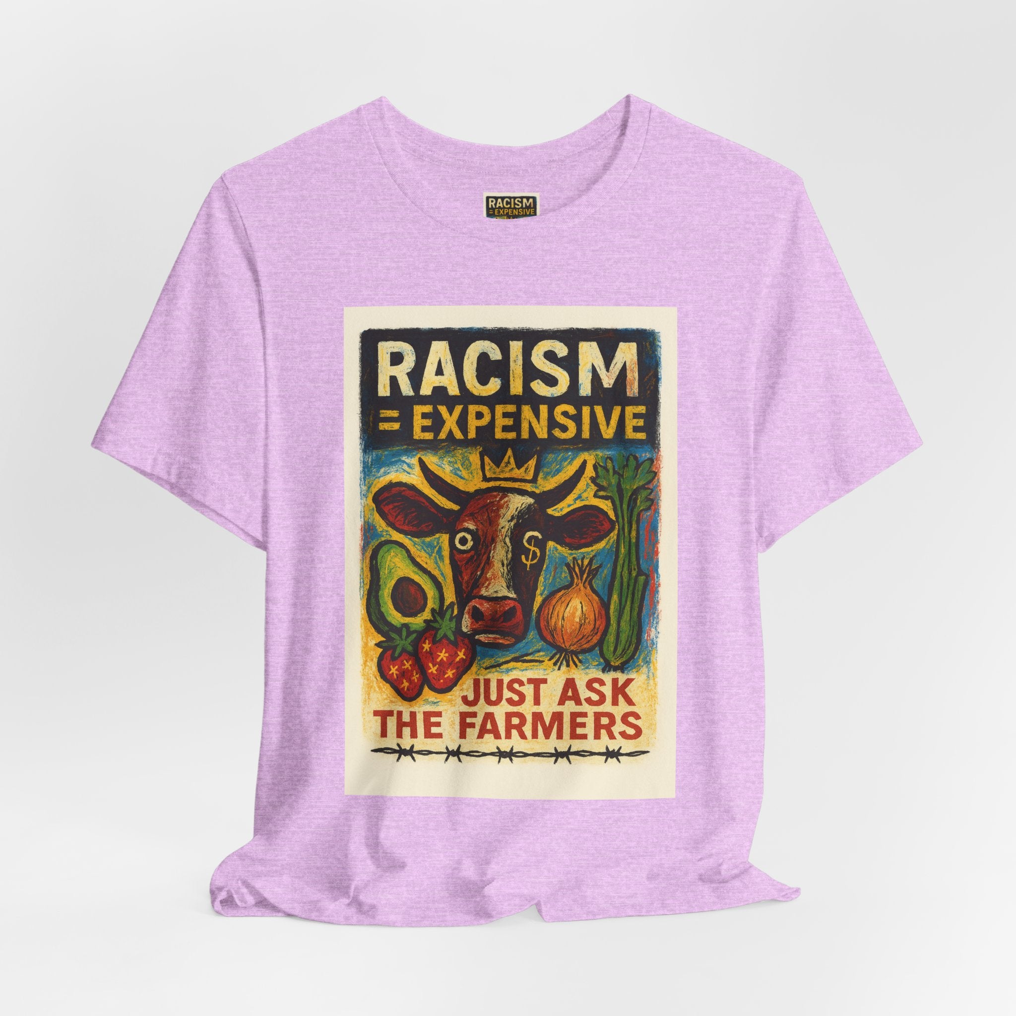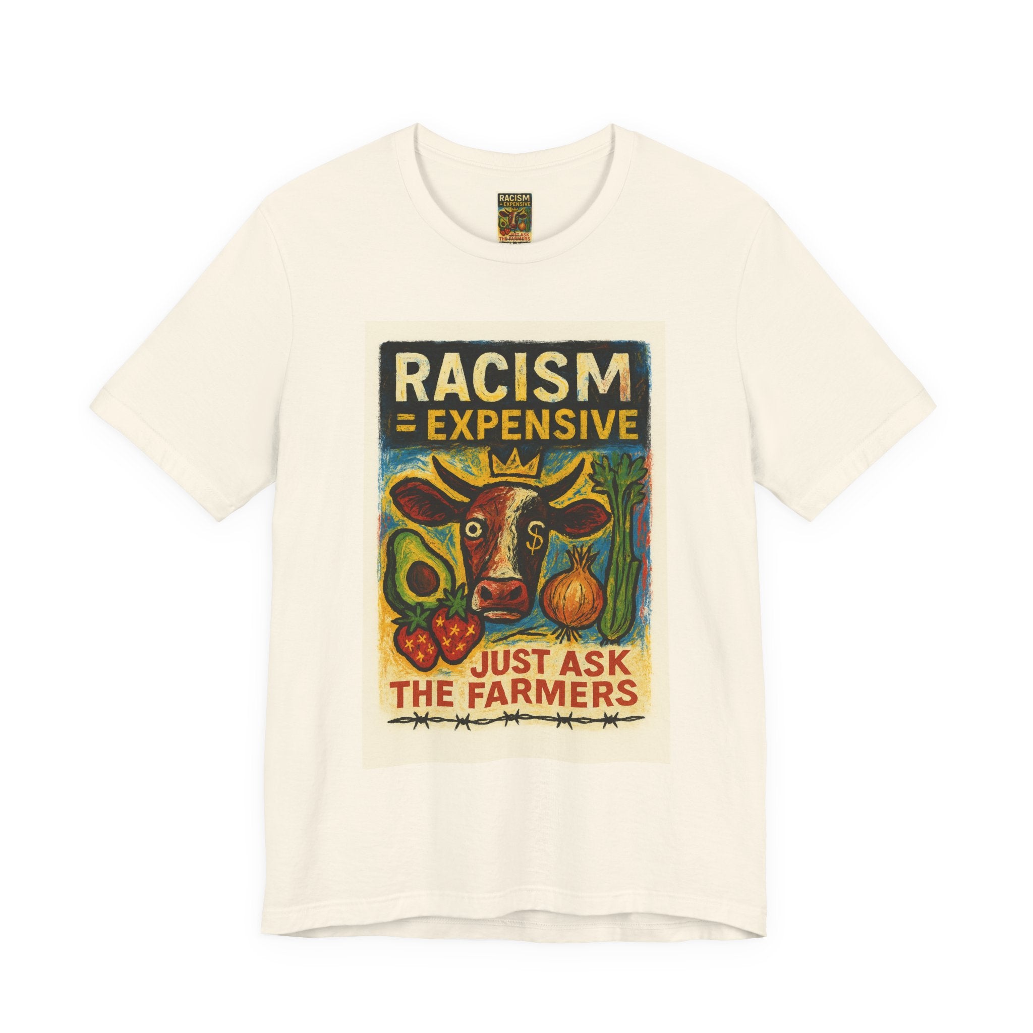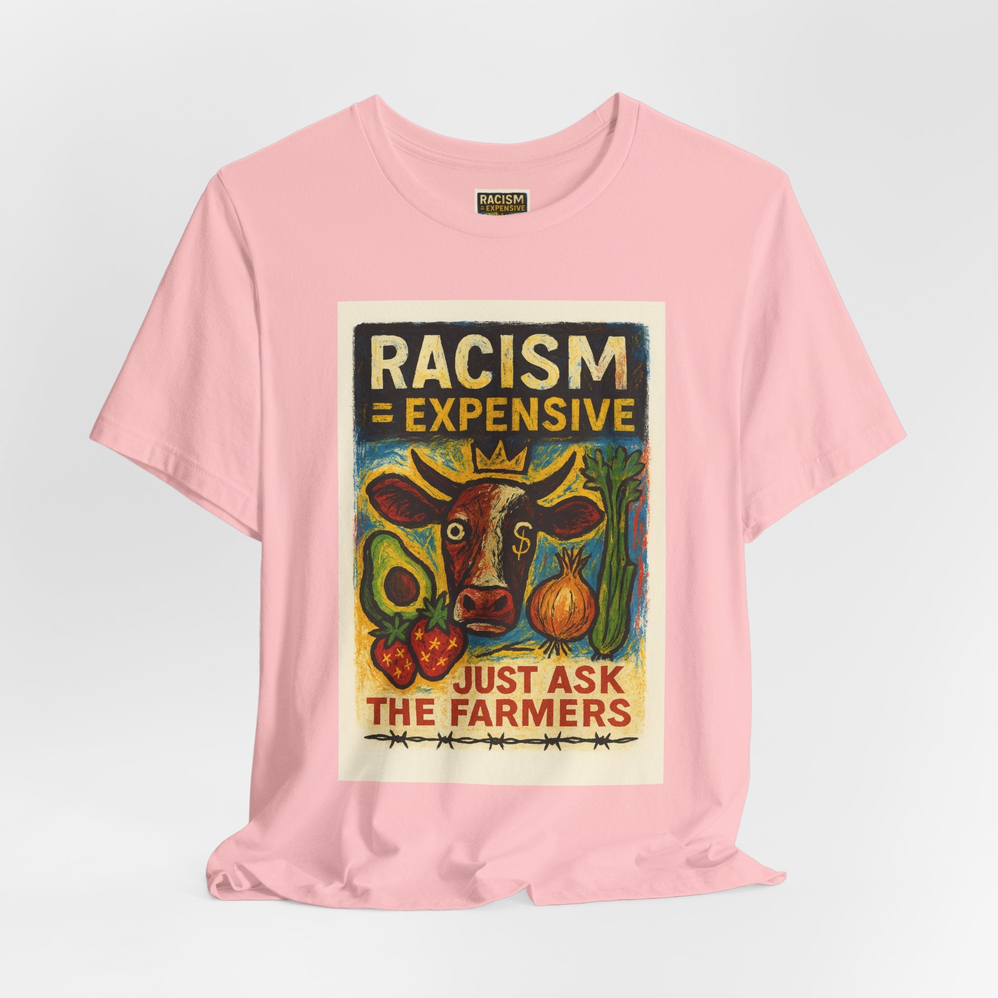 This lightweight, soft cotton tee carries a bold, hand-illustrated message: “Racism = Expensive — Just Ask The Farmers.” The vintage-style artwork centers a warm-toned cow and farm produce, blending folk-art charm with a clear social statement. Wear it when you want your clothes to speak with warmth and conviction — whether you’re at a local market, a community meeting, or out running errands. The crew neckline and retail fit keep the silhouette clean and easy to layer. Ethically made blanks and a tear-away label keep the shirt comfortable for long days on the move.