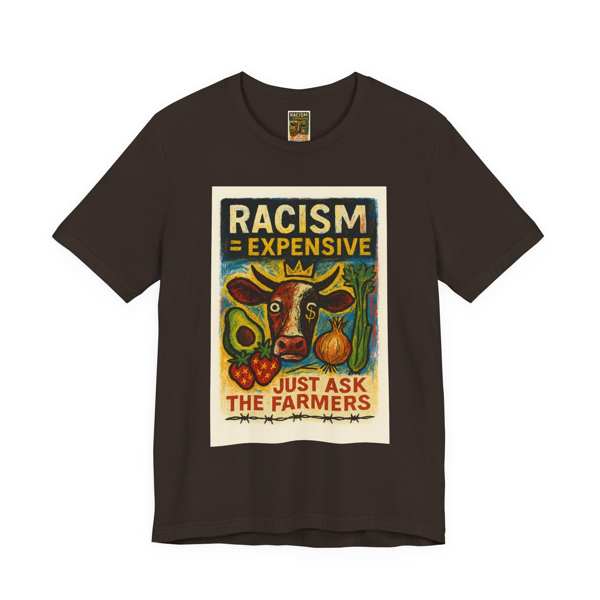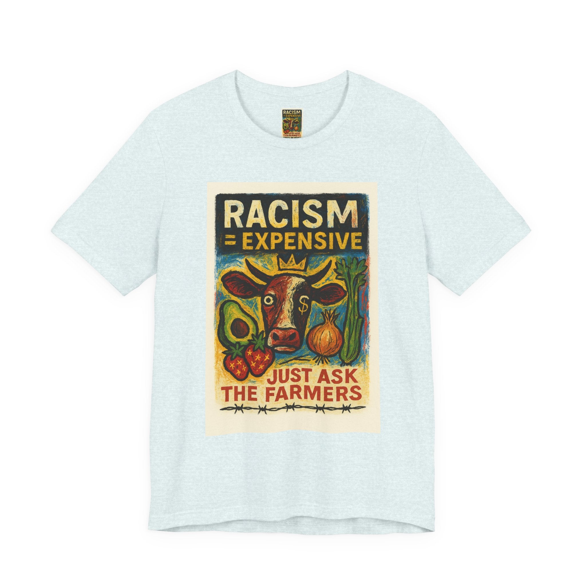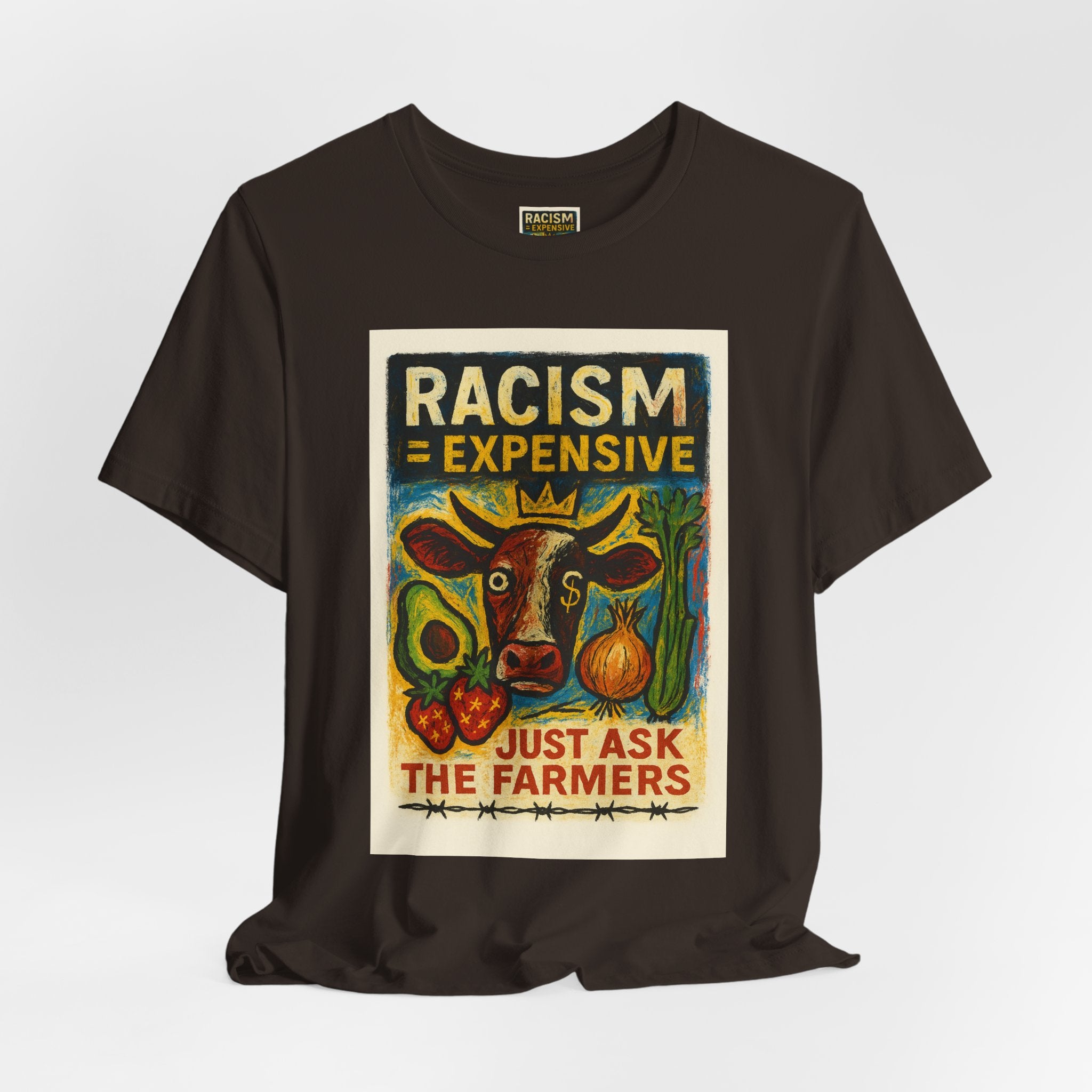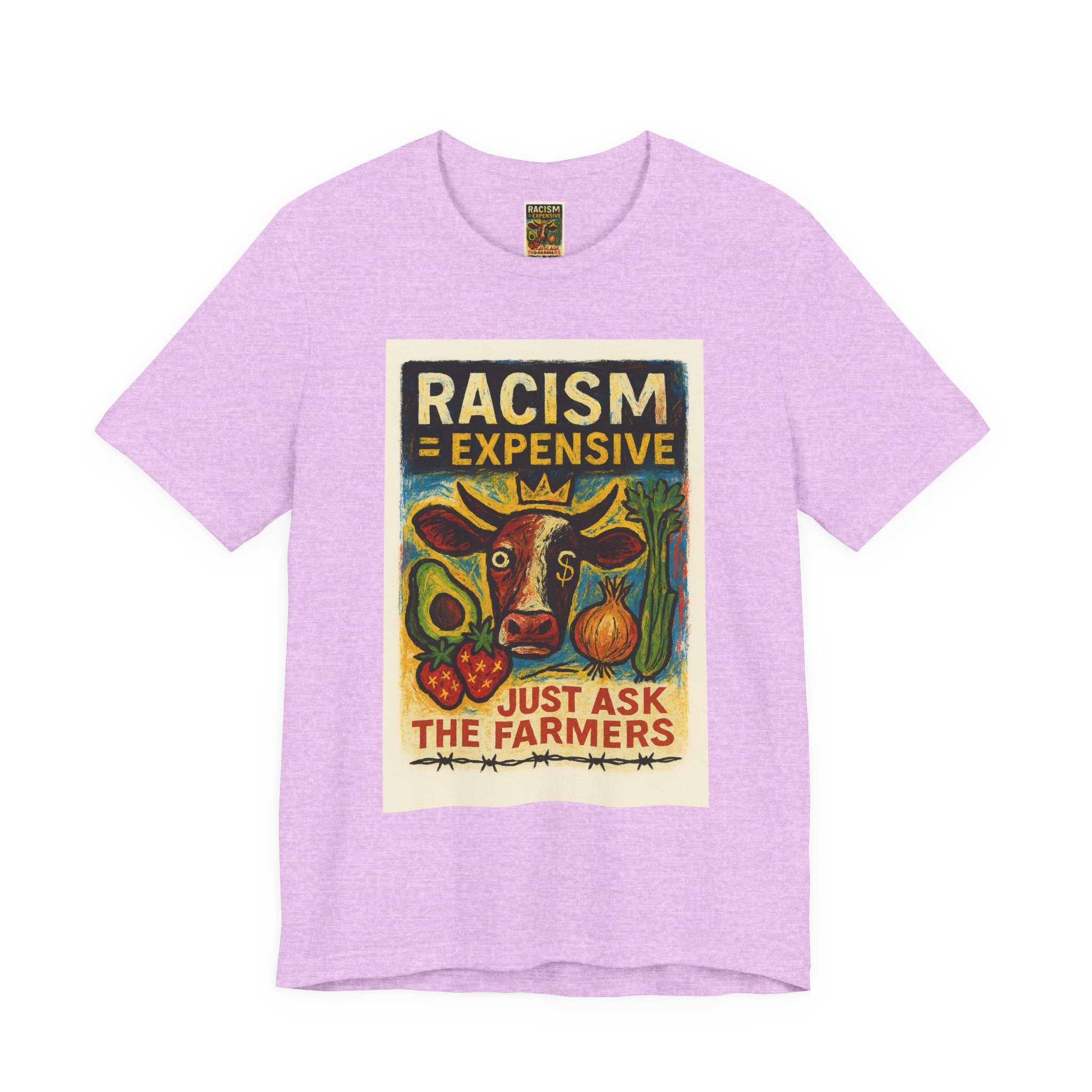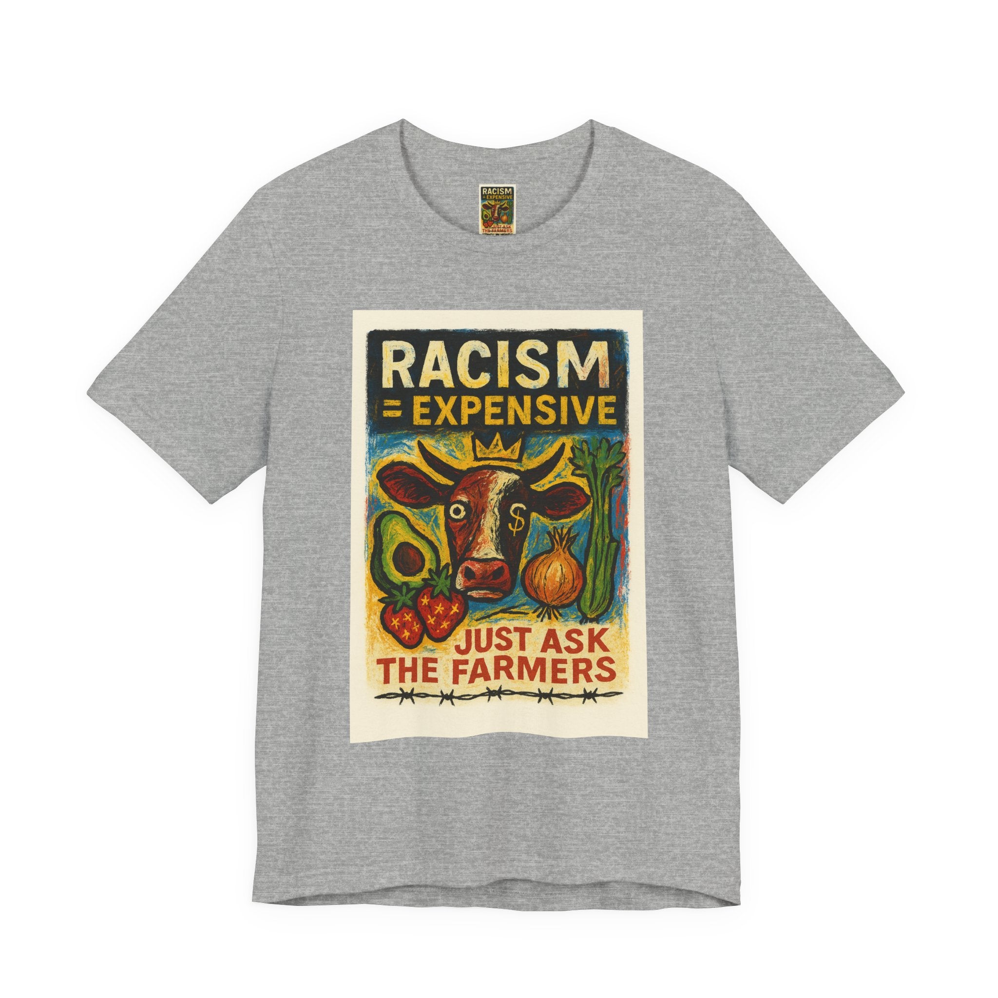 This lightweight, soft cotton tee carries a bold, hand-illustrated message: “Racism = Expensive — Just Ask The Farmers.” The vintage-style artwork centers a warm-toned cow and farm produce, blending folk-art charm with a clear social statement. Wear it when you want your clothes to speak with warmth and conviction — whether you’re at a local market, a community meeting, or out running errands. The crew neckline and retail fit keep the silhouette clean and easy to layer. Ethically made blanks and a tear-away label keep the shirt comfortable for long days on the move.