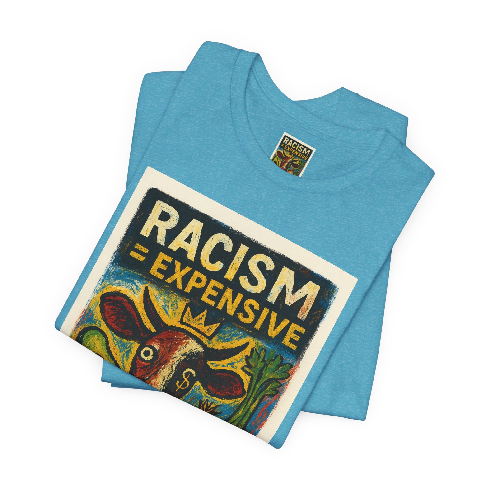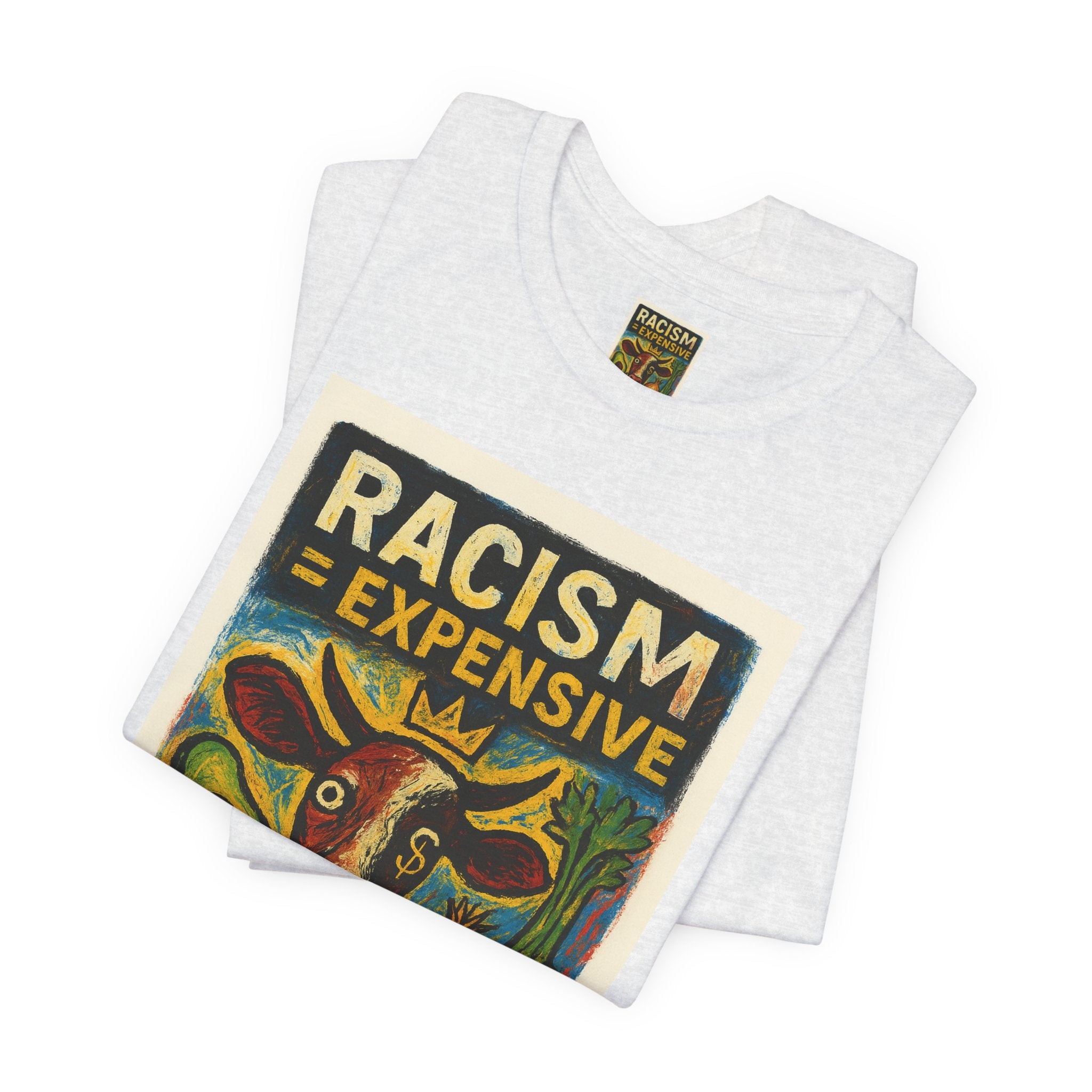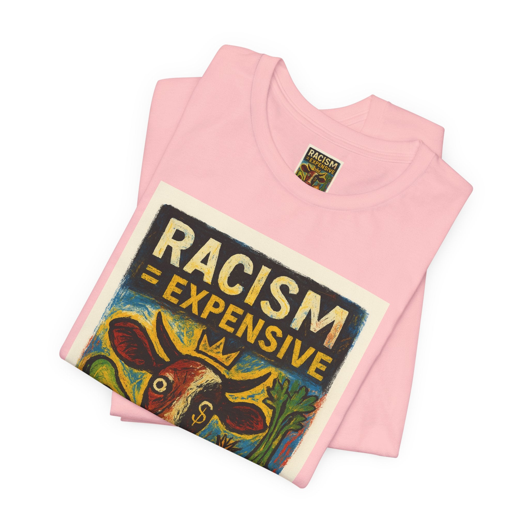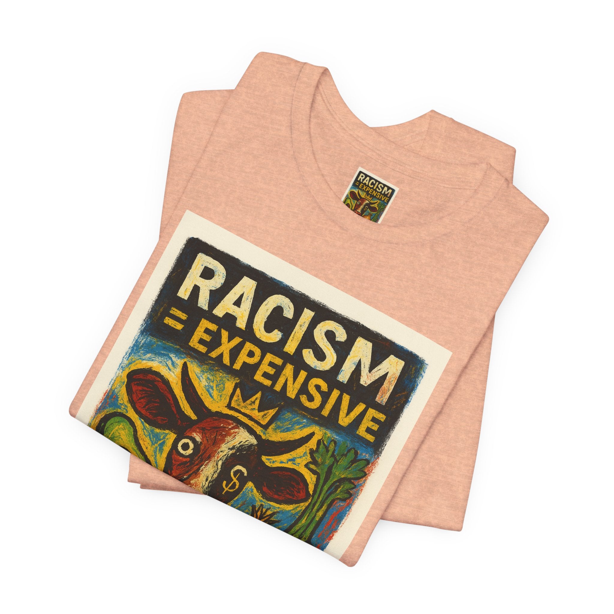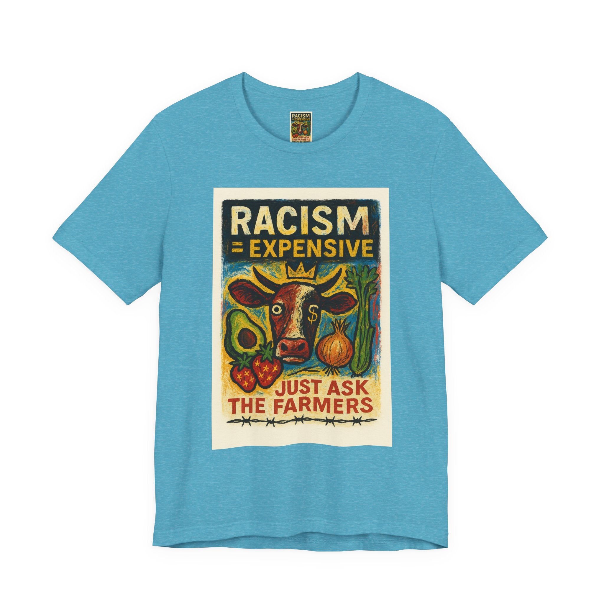 This lightweight, soft cotton tee carries a bold, hand-illustrated message: “Racism = Expensive — Just Ask The Farmers.” The vintage-style artwork centers a warm-toned cow and farm produce, blending folk-art charm with a clear social statement. Wear it when you want your clothes to speak with warmth and conviction — whether you’re at a local market, a community meeting, or out running errands. The crew neckline and retail fit keep the silhouette clean and easy to layer. Ethically made blanks and a tear-away label keep the shirt comfortable for long days on the move.