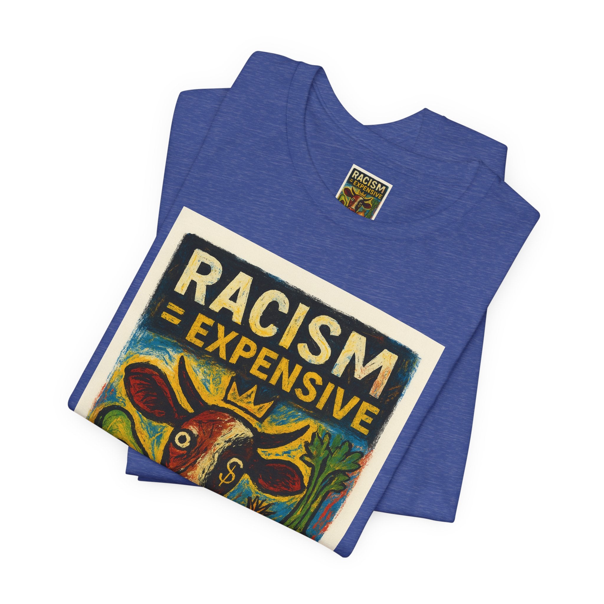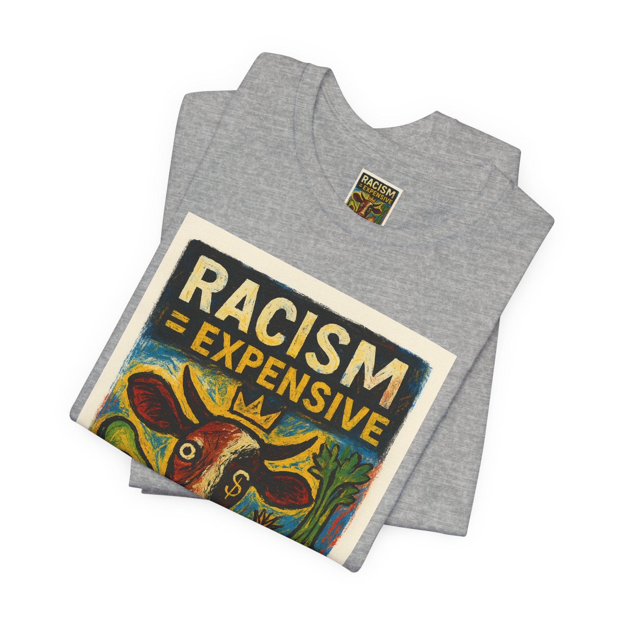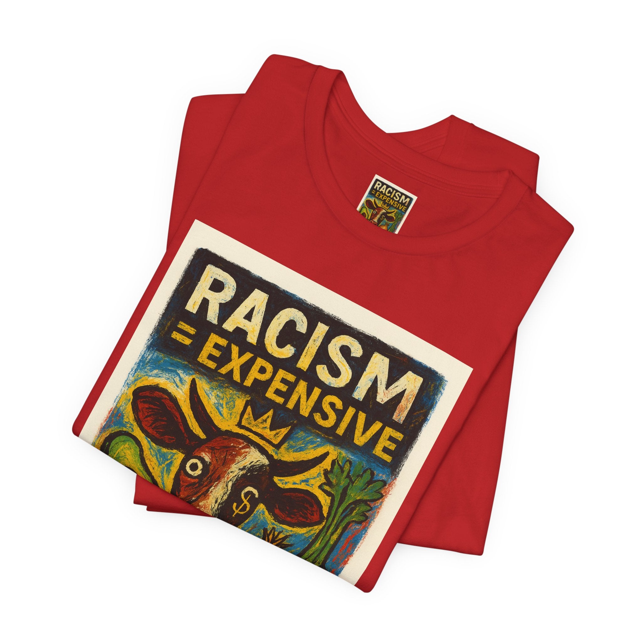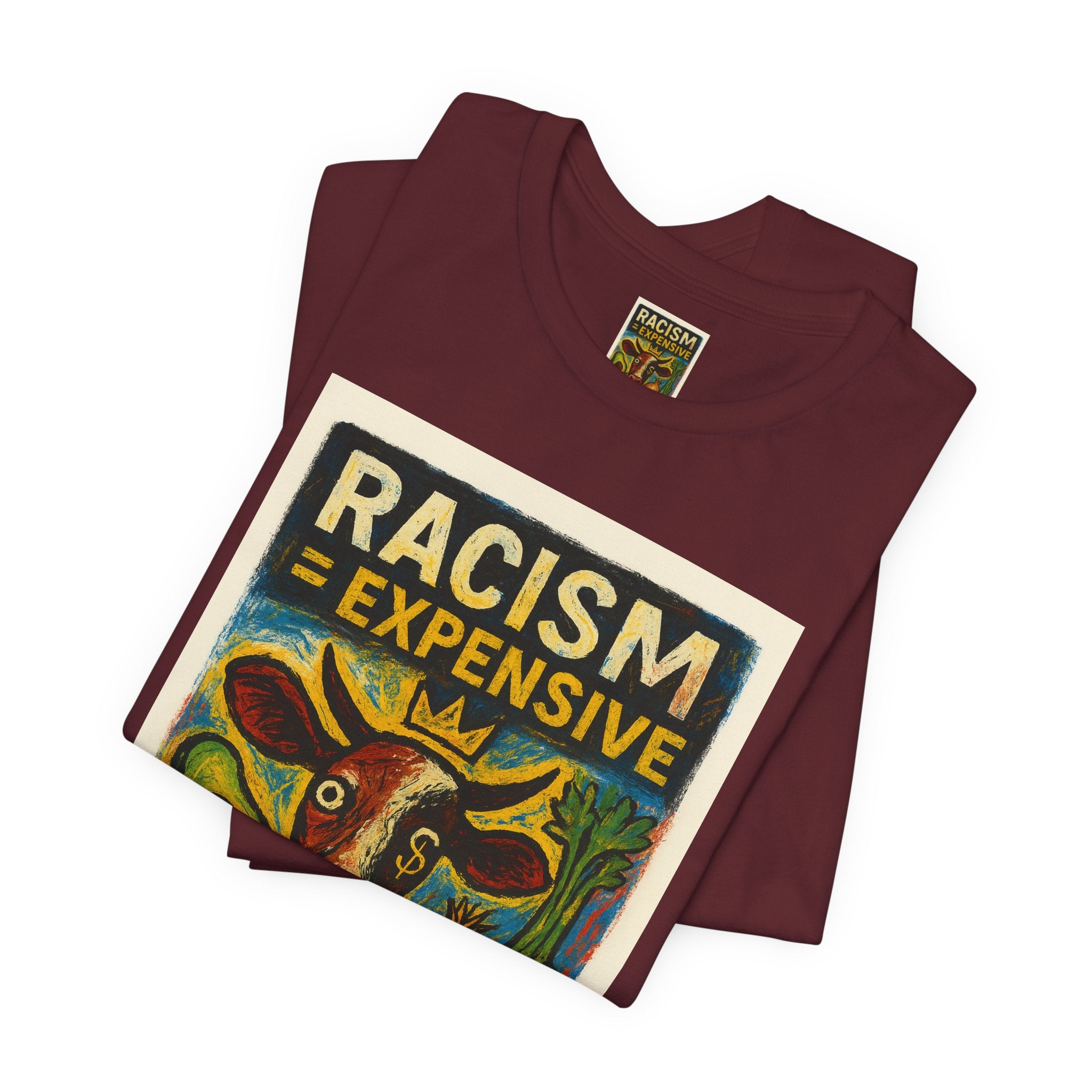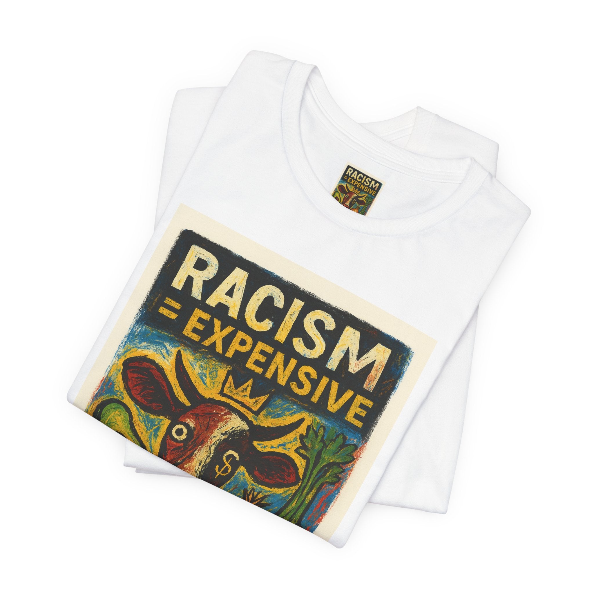This lightweight, soft cotton tee carries a bold, hand-illustrated message: “Racism = Expensive — Just Ask The Farmers.” The vintage-style artwork centers a warm-toned cow and farm produce, blending folk-art charm with a clear social statement. Wear it when you want your clothes to speak with warmth and conviction — whether you’re at a local market, a community meeting, or out running errands. The crew neckline and retail fit keep the silhouette clean and easy to layer. Ethically made blanks and a tear-away label keep the shirt comfortable for long days on the move.