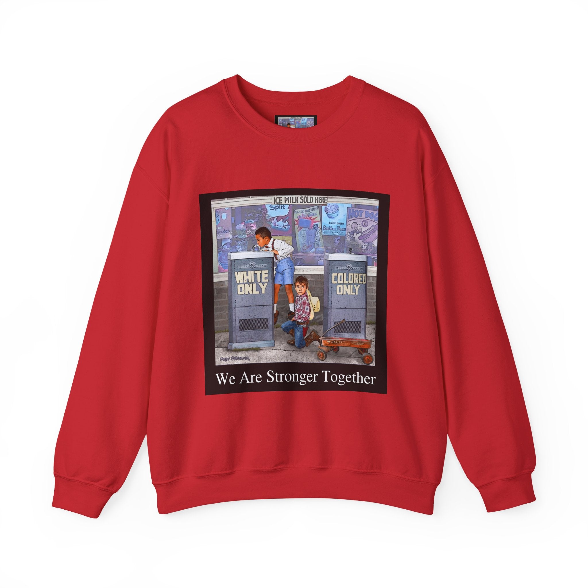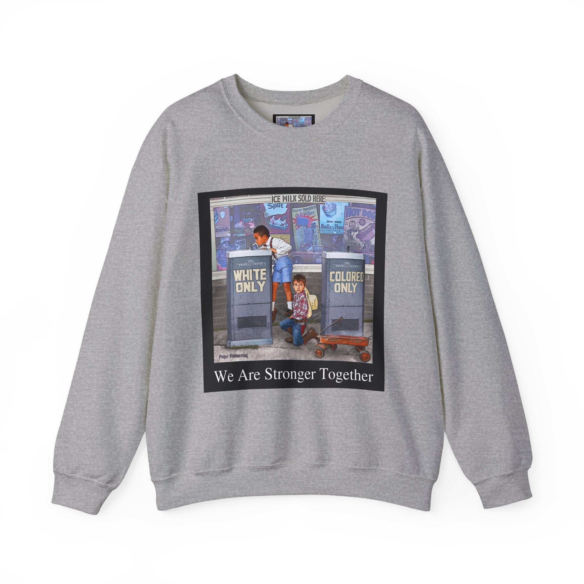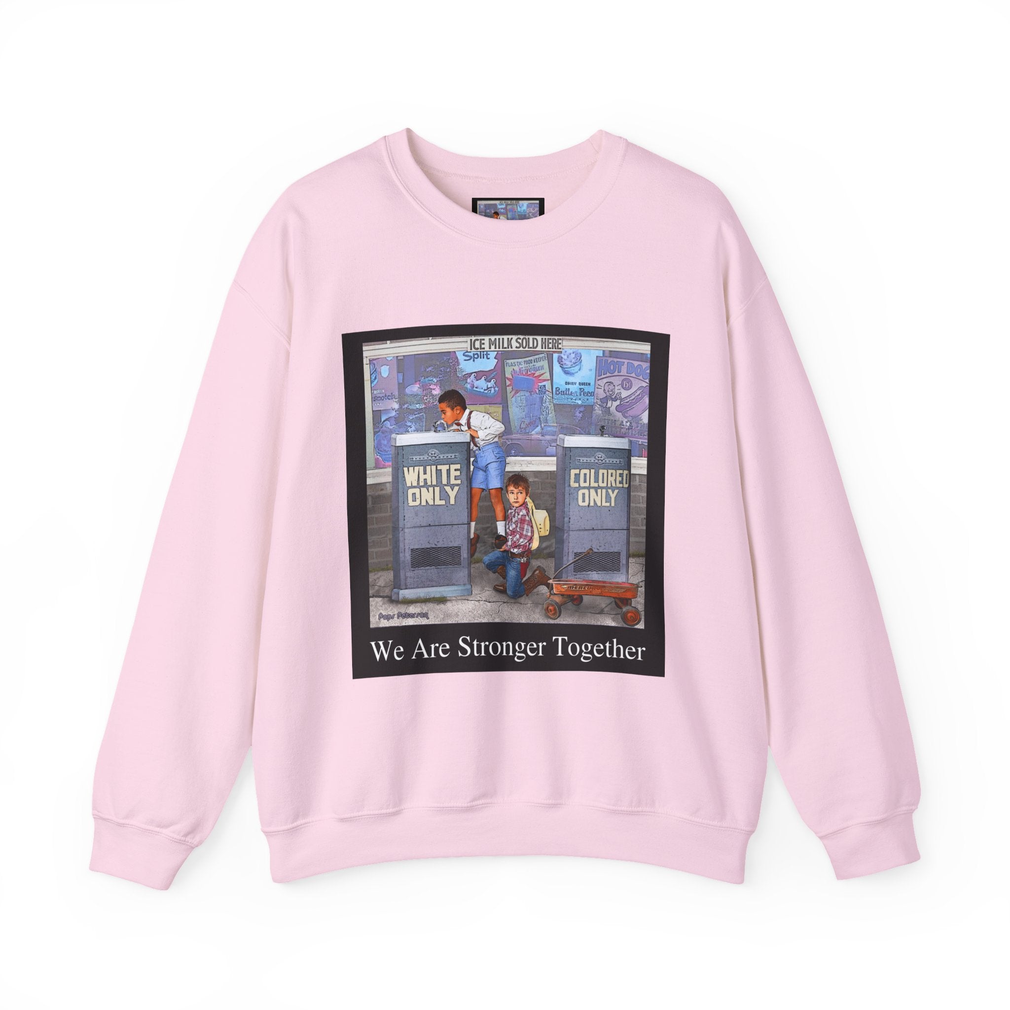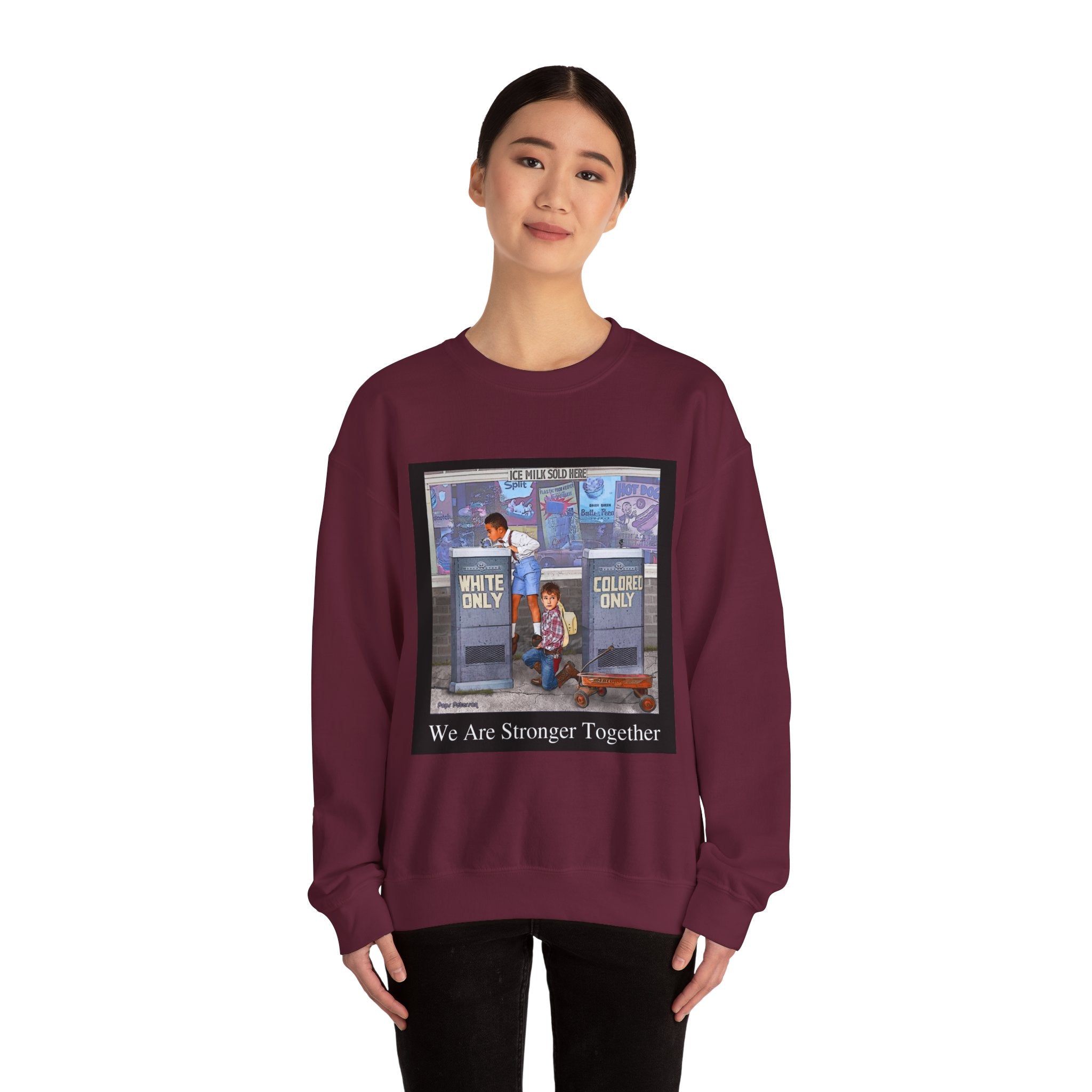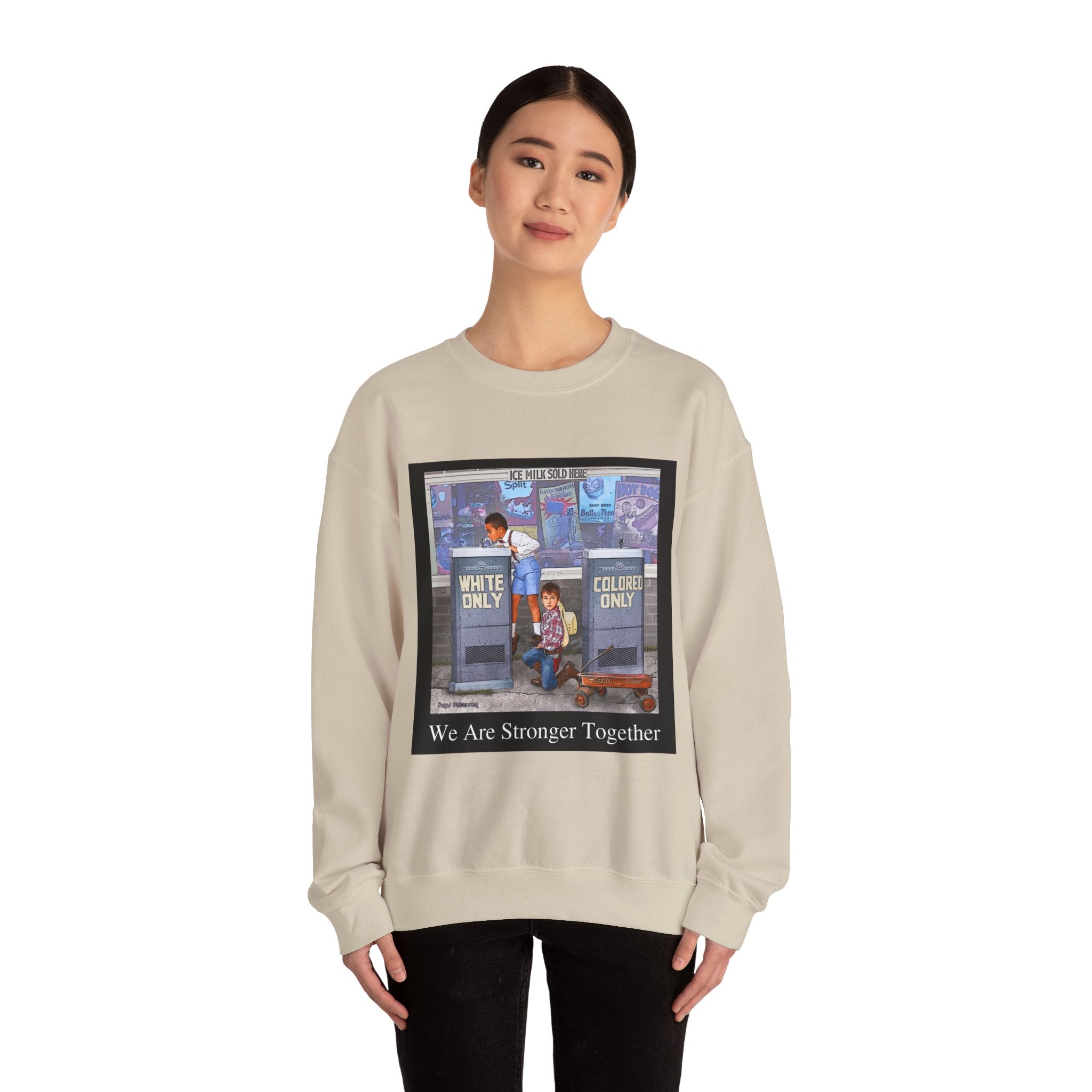 This sweatshirt carries a quiet, powerful message. A framed illustration shows two children at segregated phone booths—one labeled "White Only," the other "Colored Only"—while the caption beneath reads, "We Are Stronger Together." The image sits on a soft, mid-weight crewneck that drapes easily over layers and settles into everyday wear. It’s a wearable conversation starter that honors shared humanity and remembers the struggle for equality. Wear it to gatherings, demonstrations, or slow, thoughtful outings where the statement can be seen and reflected on. The tone is reflective rather than flashy—meant to invite connection, spark discussion, and hold space for memory and hope.