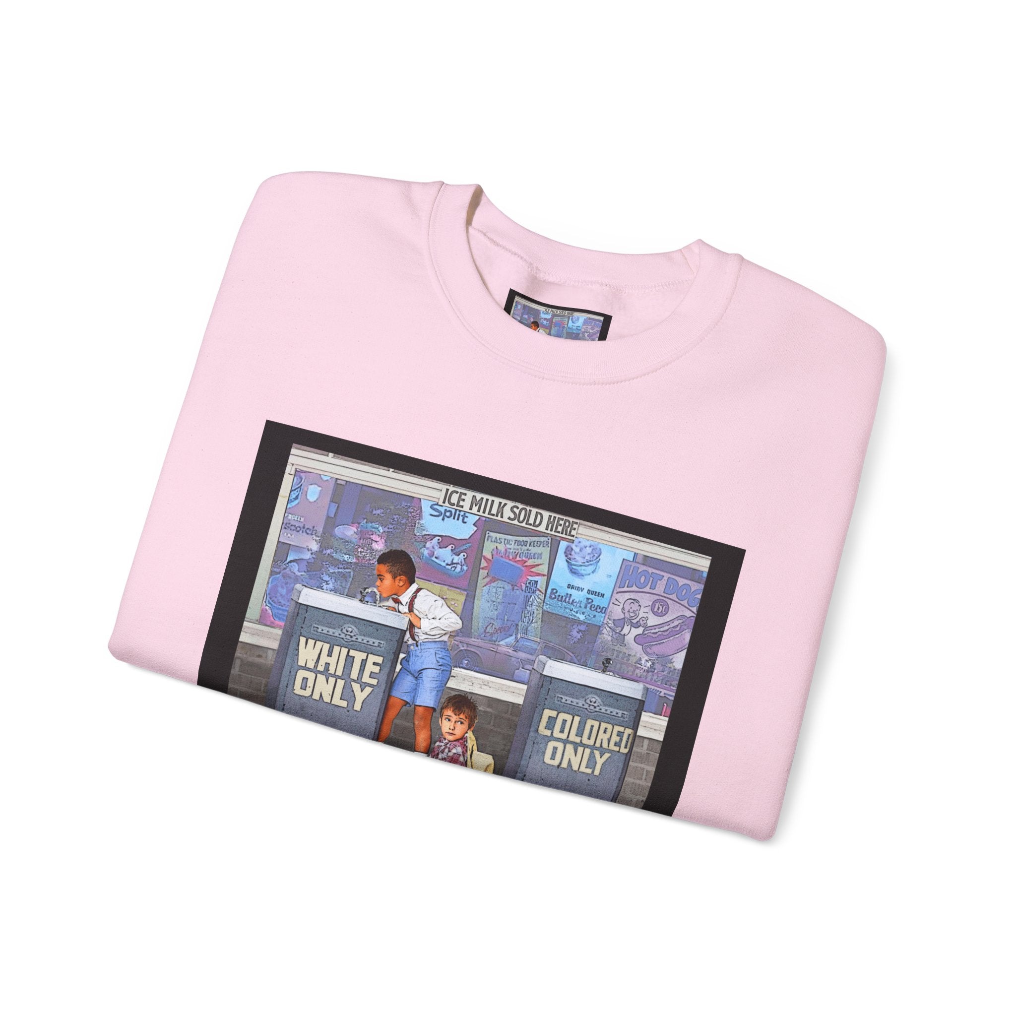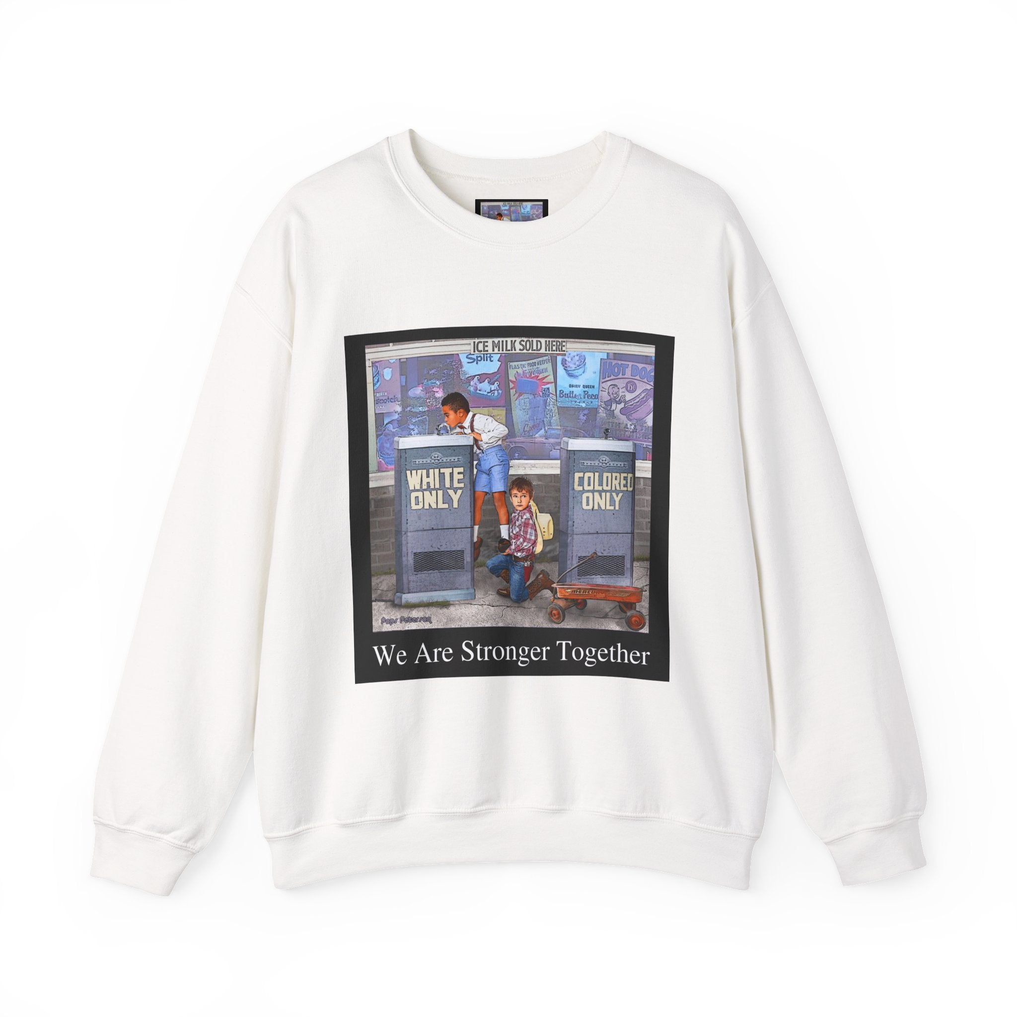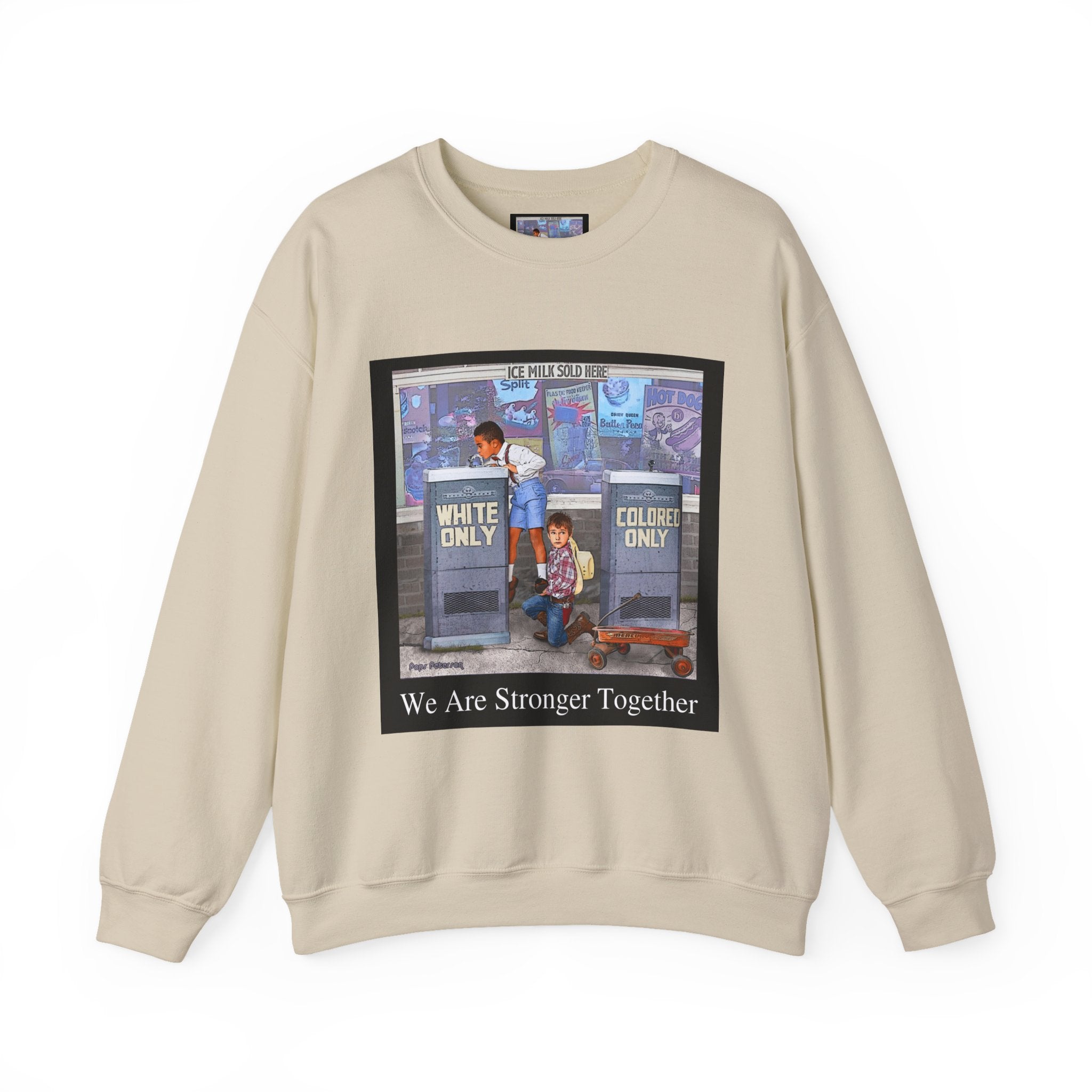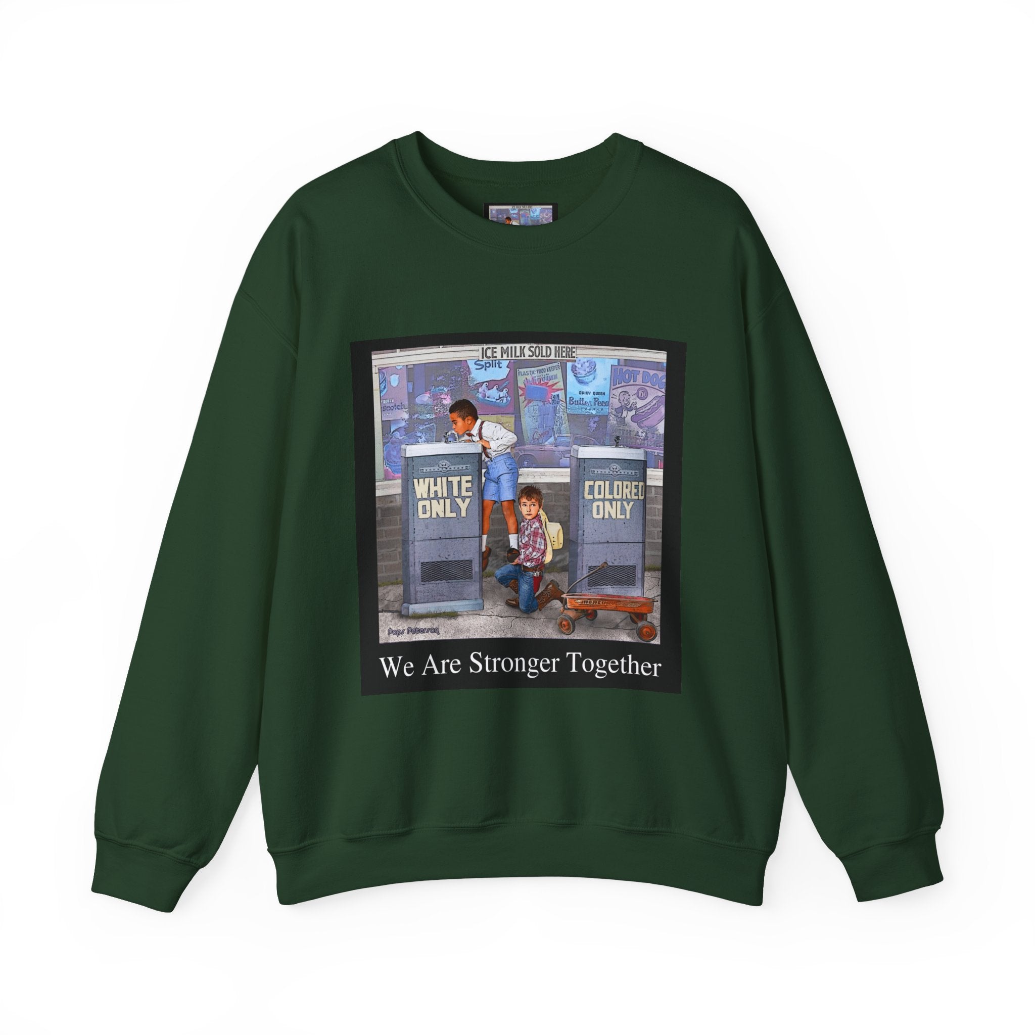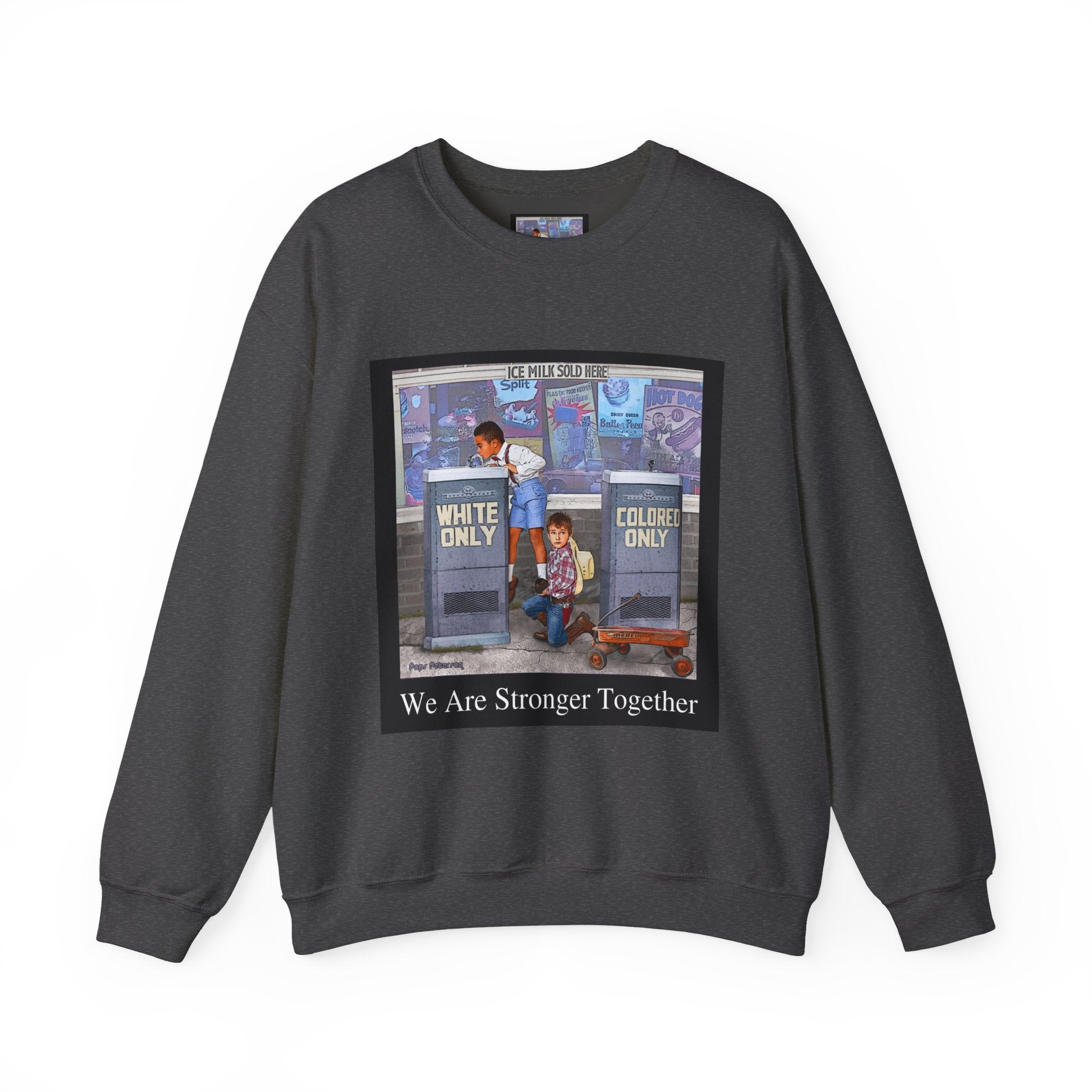 This sweatshirt carries a quiet, powerful message. A framed illustration shows two children at segregated phone booths—one labeled "White Only," the other "Colored Only"—while the caption beneath reads, "We Are Stronger Together." The image sits on a soft, mid-weight crewneck that drapes easily over layers and settles into everyday wear. It’s a wearable conversation starter that honors shared humanity and remembers the struggle for equality. Wear it to gatherings, demonstrations, or slow, thoughtful outings where the statement can be seen and reflected on. The tone is reflective rather than flashy—meant to invite connection, spark discussion, and hold space for memory and hope.