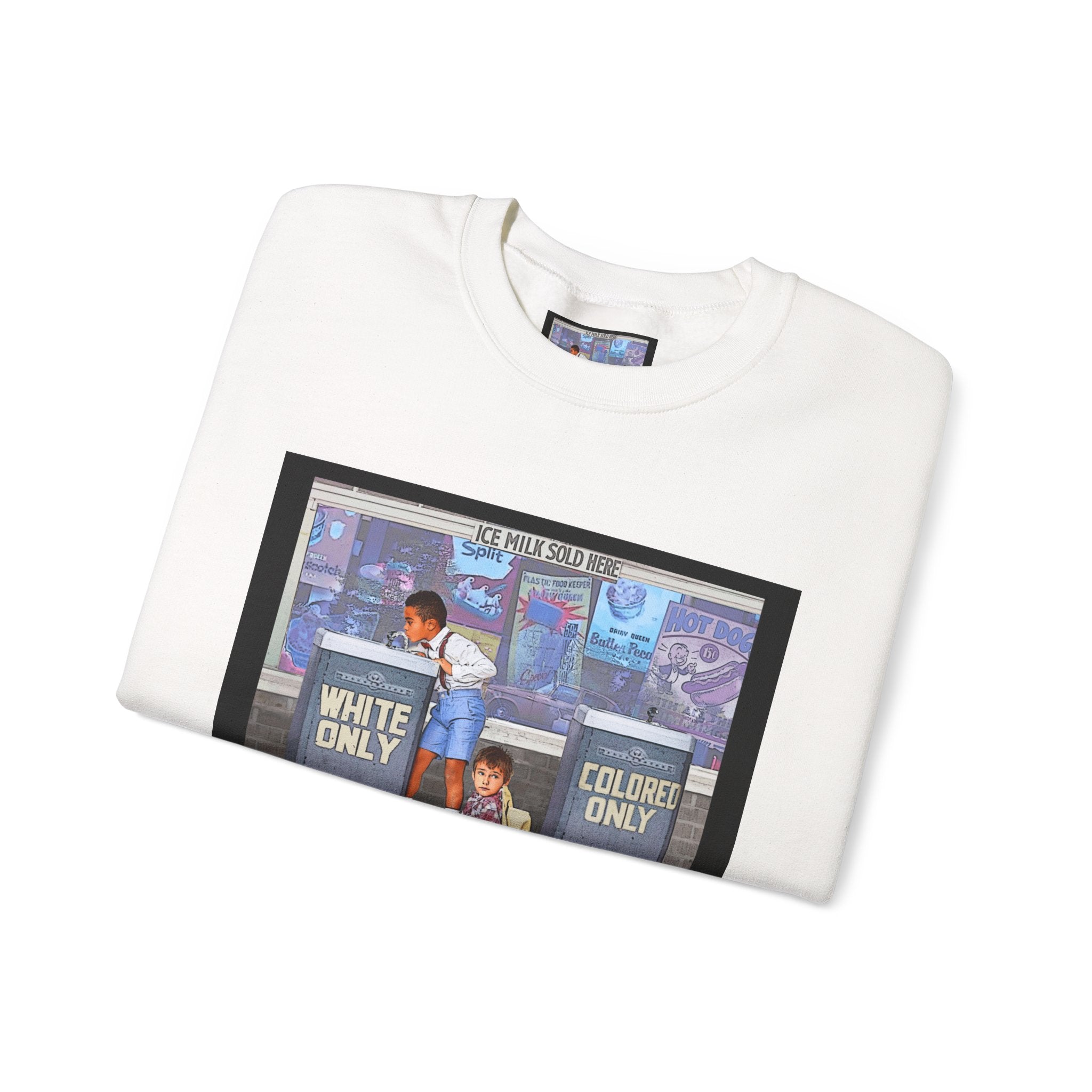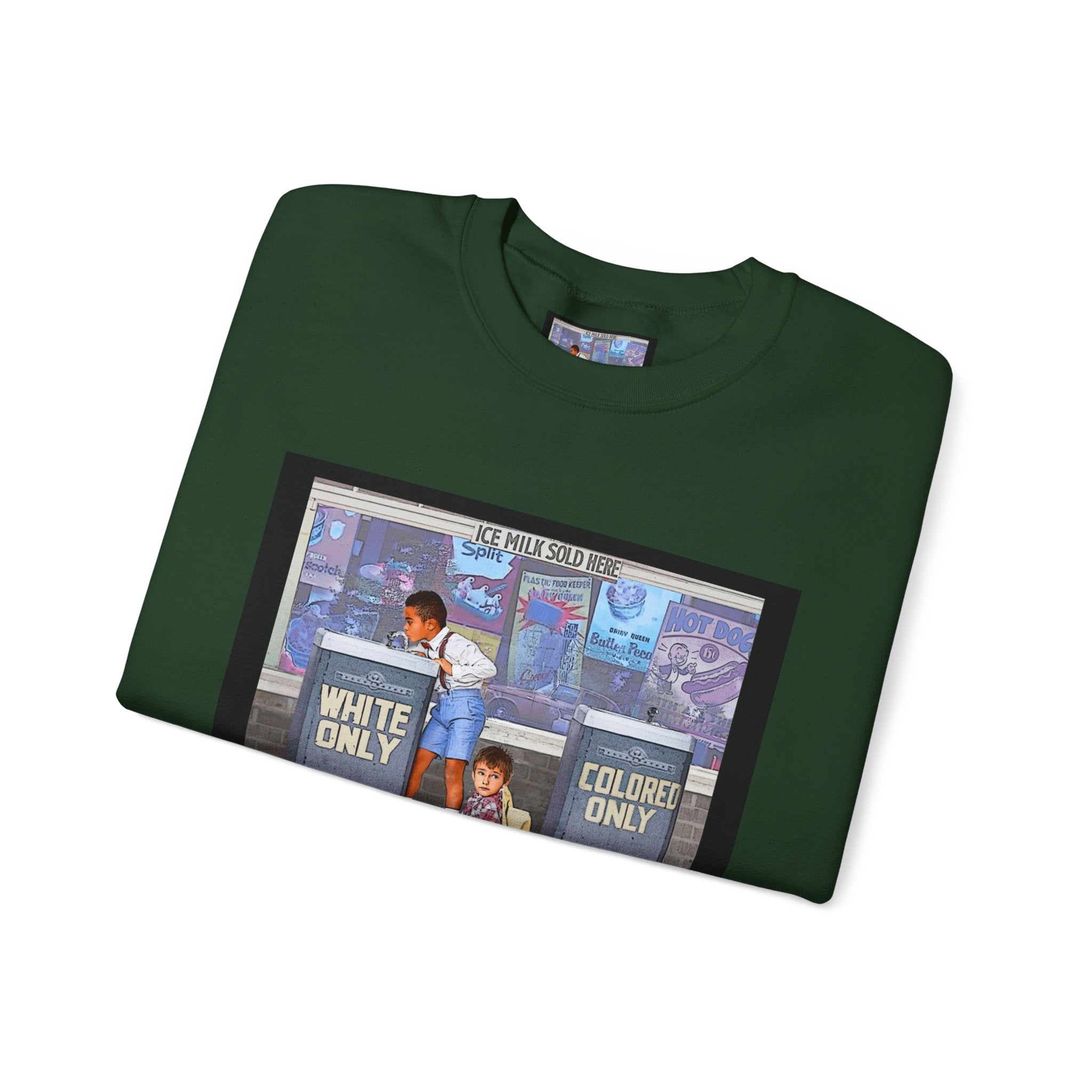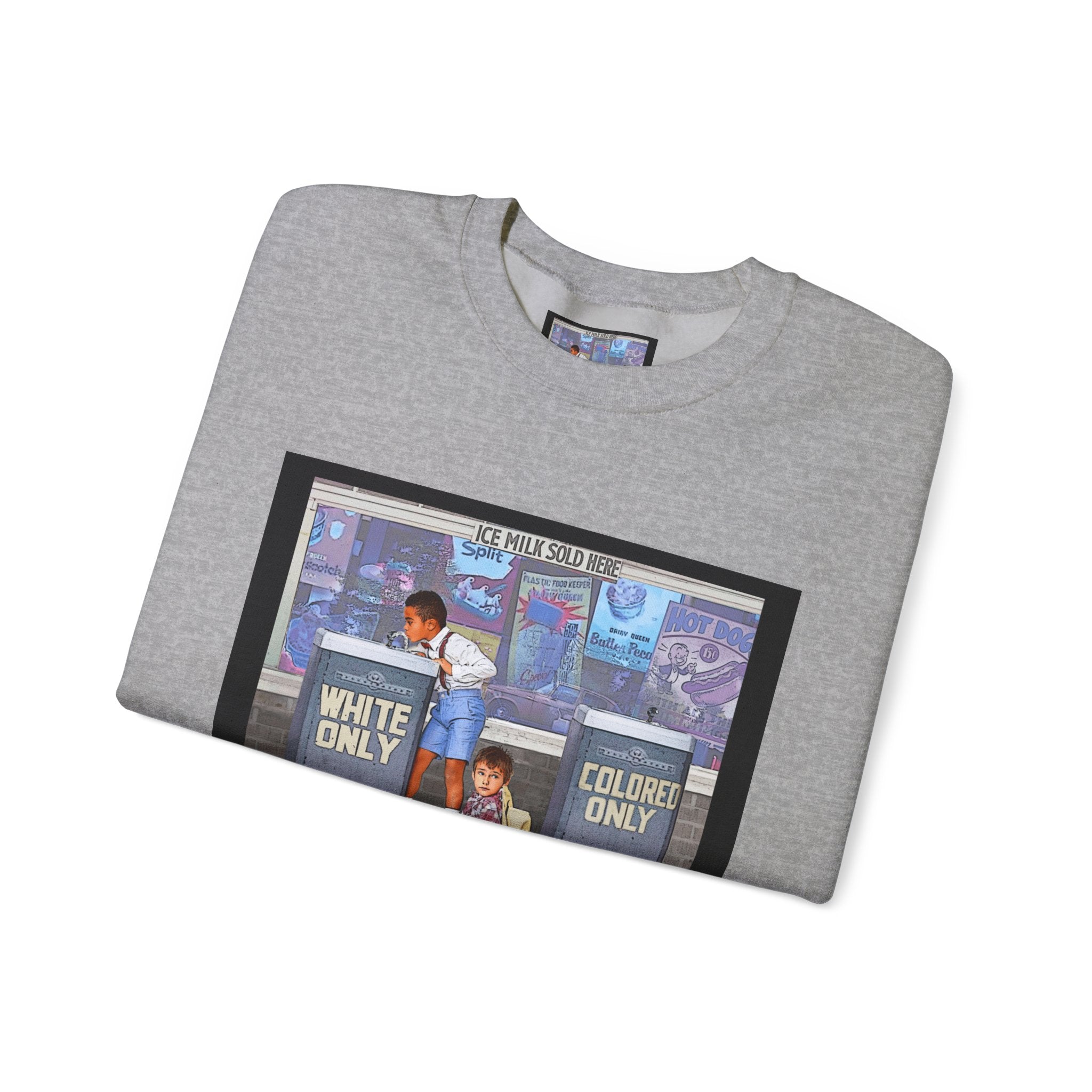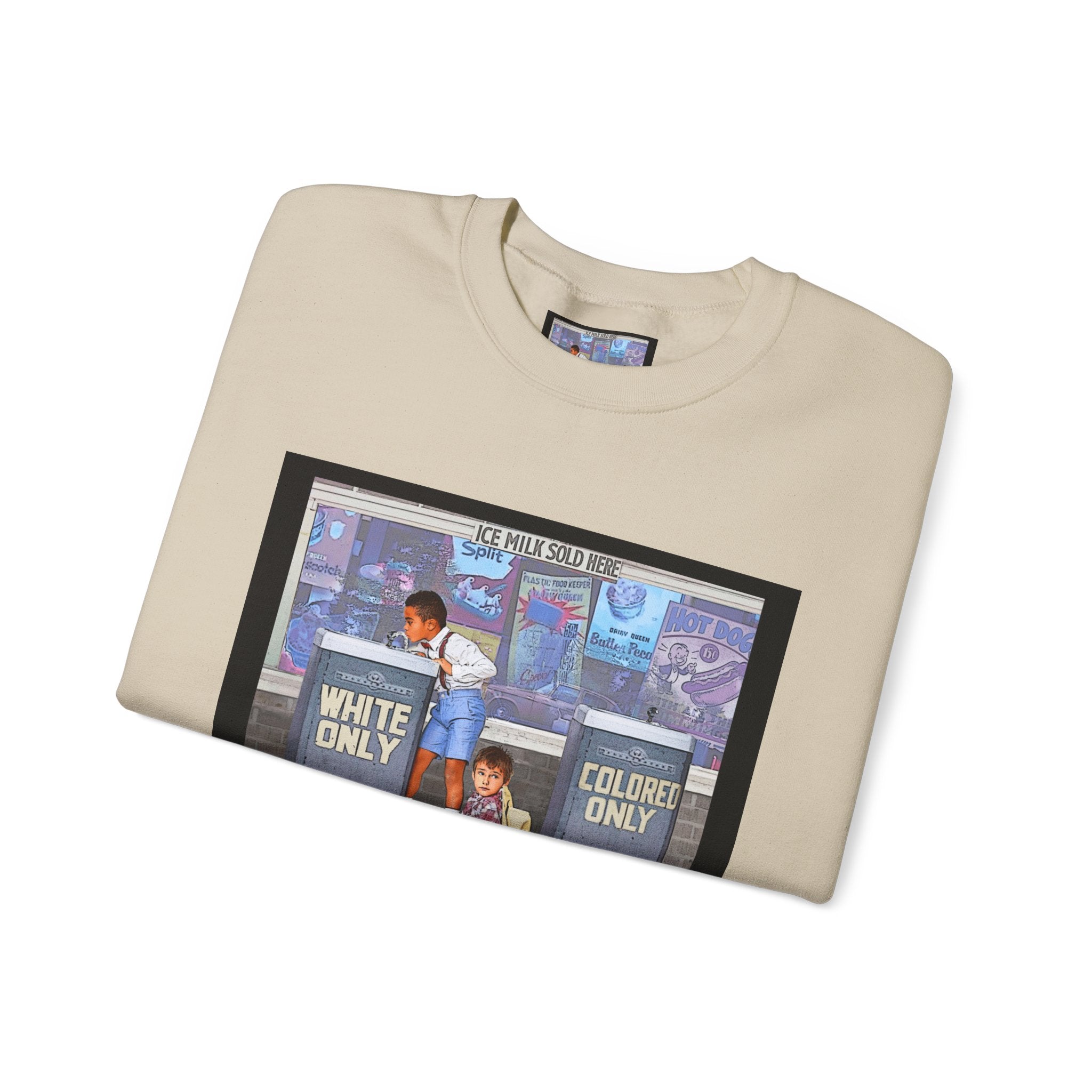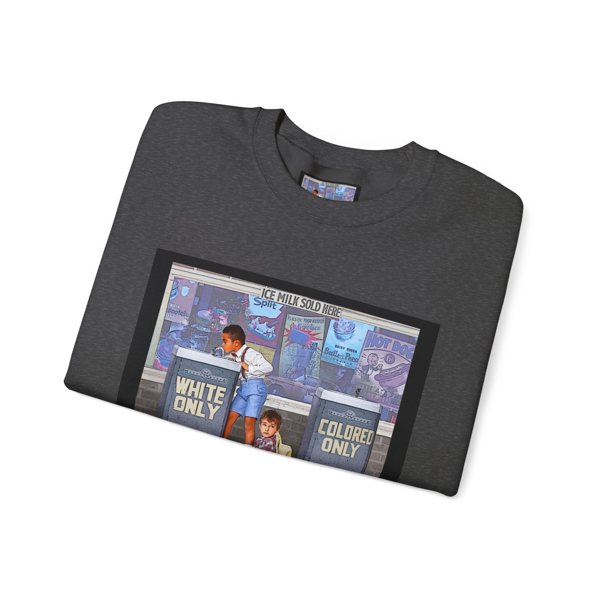 This sweatshirt carries a quiet, powerful message. A framed illustration shows two children at segregated phone booths—one labeled "White Only," the other "Colored Only"—while the caption beneath reads, "We Are Stronger Together." The image sits on a soft, mid-weight crewneck that drapes easily over layers and settles into everyday wear. It’s a wearable conversation starter that honors shared humanity and remembers the struggle for equality. Wear it to gatherings, demonstrations, or slow, thoughtful outings where the statement can be seen and reflected on. The tone is reflective rather than flashy—meant to invite connection, spark discussion, and hold space for memory and hope.