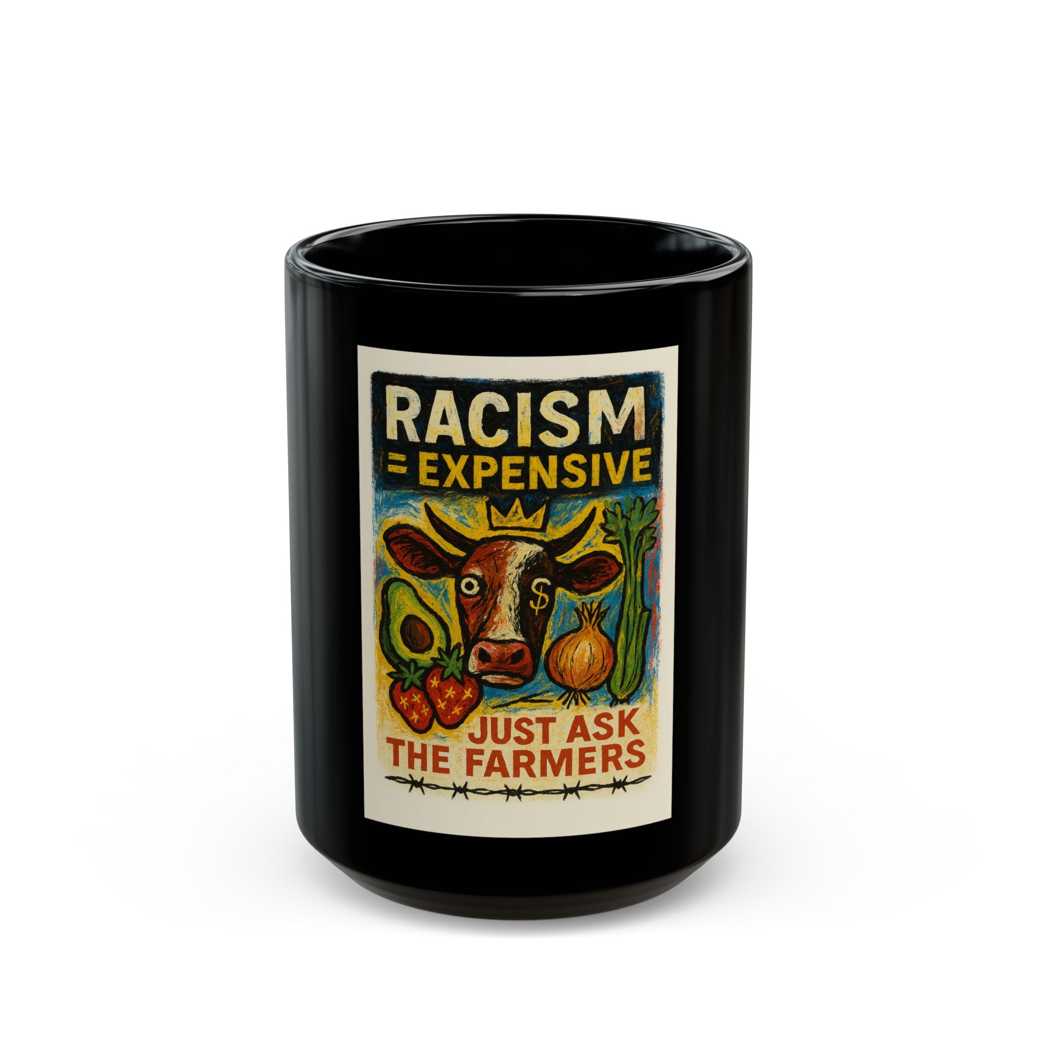 The Racism = Expensive Coffee Mug is a bold, conversation-starting piece of political satire and social commentary. Crafted in deep black ceramic with a high-resolution vintage-style print reading “Just Ask the Farmers,” this mug brings meaningful humor to your everyday coffee routine.